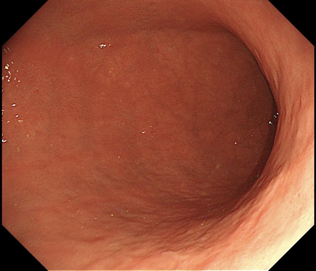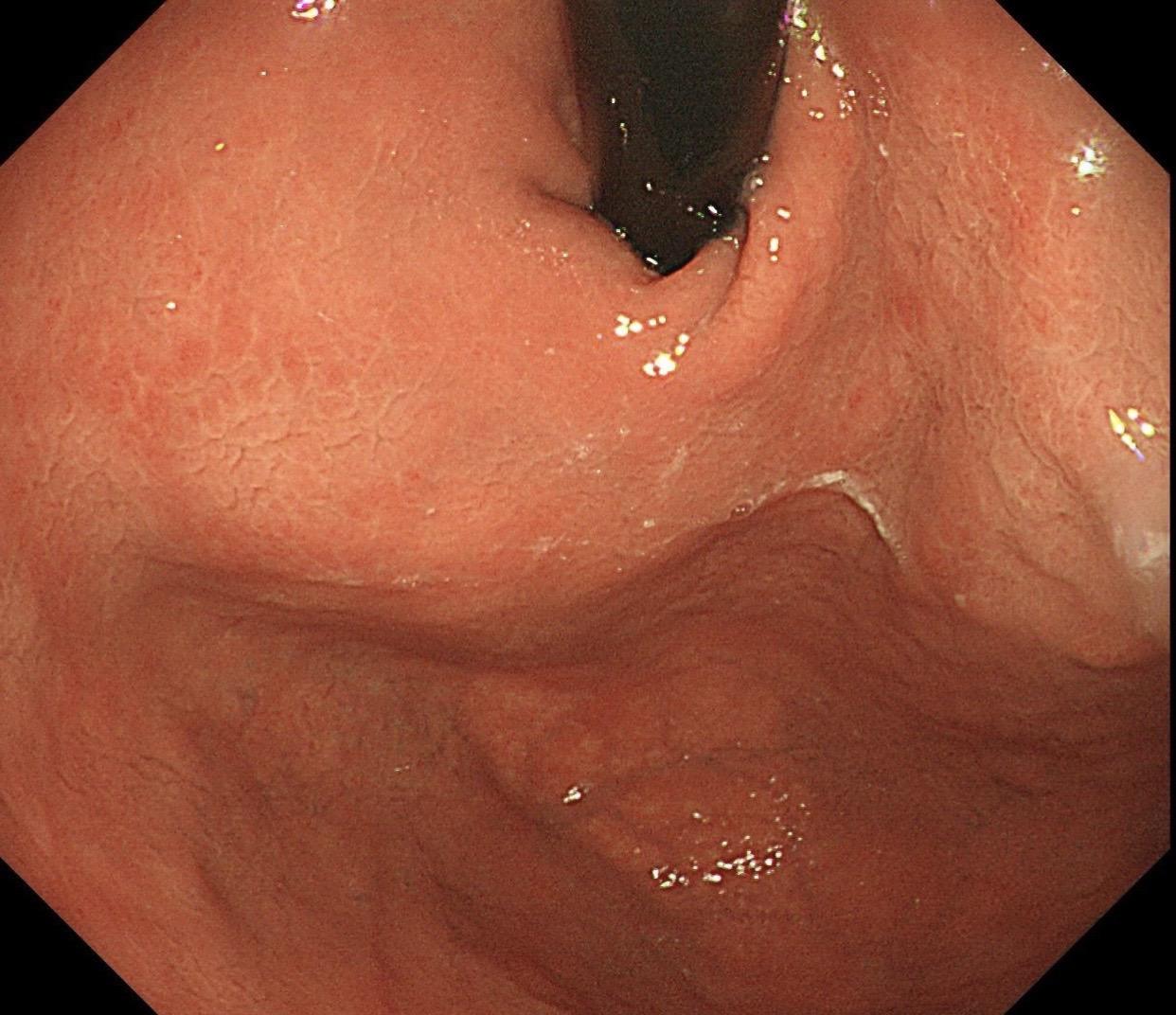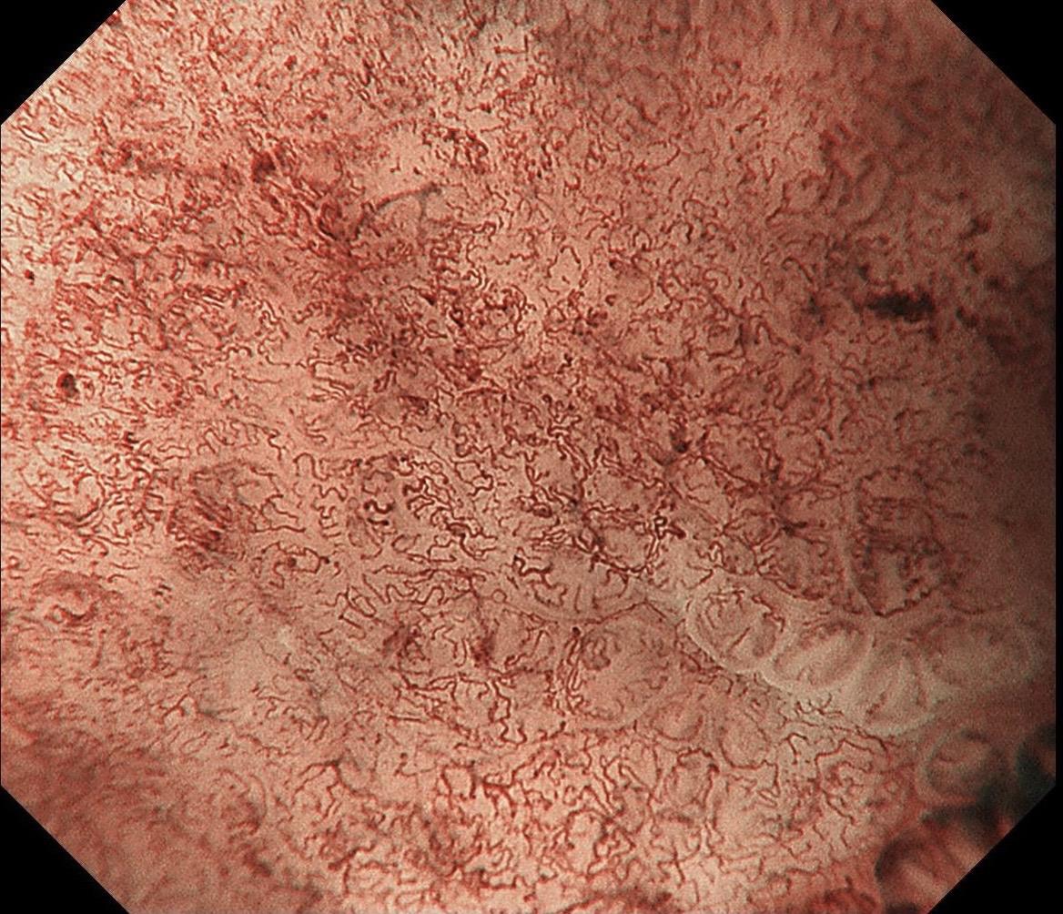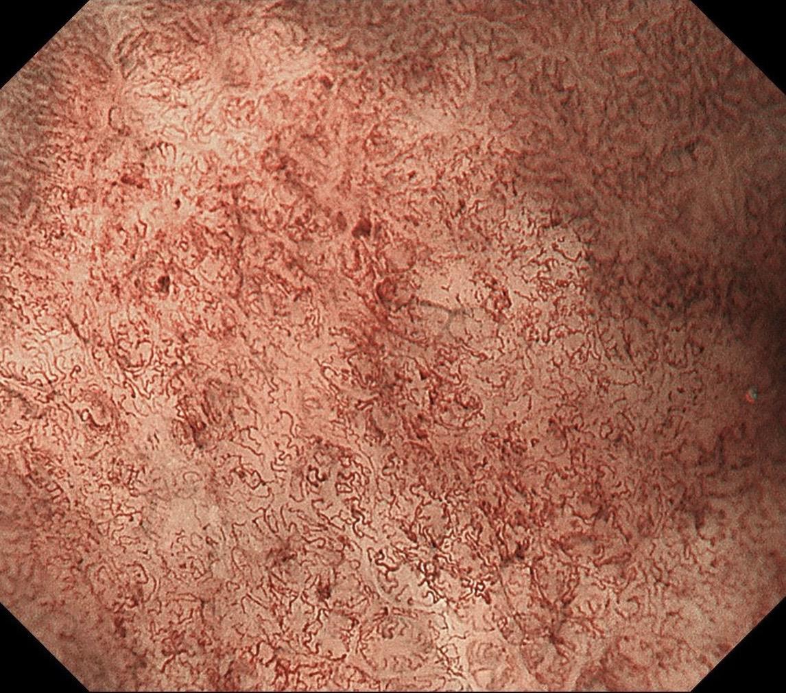 男,40岁,胃双发褪色调病变。慢性胃炎复查,3年前胃镜未见异常,Hp阳性背景,萎缩不明显,胃体下部大弯见一褪色调病变,浅凹陷,5mm左右,换用放大内镜观察,表面结构缺失,血管异型明显,未分化可能性大……胃窦后壁见一白斑,无高度差,NBI浅茶色,放大草草看了下,似有边界,IP增宽,活检待病理……小哥哥胖得几乎没脖子,腹式呼吸太明显~😖