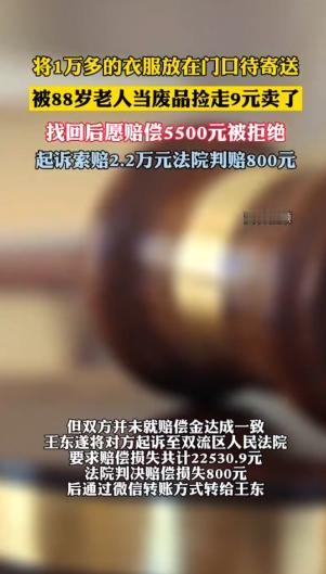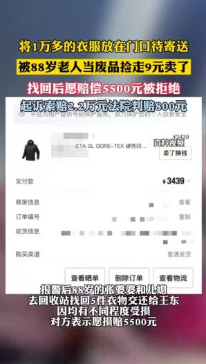 “电视都不敢这么演!”2025年10月,四川成都,一男子将10000多元的名牌衣物放在家门口,等待快递员上门取件,没想到88岁的邻居老太以为是废品直接捡走,9元就给卖了!网友:邮寄贵重物品还是要交到快递员手里才放心! 一男子打算邮寄价值10000元的名牌衣物,他在在手机上预约了快递员上门取件,随后将名牌衣物都装进袋子放在了家门口,方便快递员拿取。 88岁的邻居老太根本不认识什么名牌,看到男子放在门口的衣服袋子,还以为是他不要的衣服,于是老太就捡走当废品卖给了废品回收站,加起来10000多元的几件衣服被老太卖了9块钱。 快递员来取件时没找到男子的衣服,于是给他打去了电话,男子十分诧异,赶回家寻找无果便报了警,警方经过一番排查,锁定了拿走衣服的邻居老太。 得知那袋衣服的价格后,老太太和她的儿媳妇赶忙跑到废品回收站寻找,最终找回衣物交还给了男子,因为衣服都有不同程度的破损,老太太家人表示愿意赔偿5500元。 男子对于这个赔偿价格不接受,反手将老太太告上法庭,要求全款赔偿,最终,法院判老太赔偿800元,这些钱是负责衣物清洗以及折旧的费用。 不少网友表示这事双方都有错,老太太不该随便捡别人门口的东西,而男子也不该将贵重物品随意放置,10000多的衣服还是亲自交给快递员才放心啊! 信息来源:《1万多衣服被88岁老人捡走9块卖了,男子起诉索赔2.2万,法院判赔800元》半岛晨报