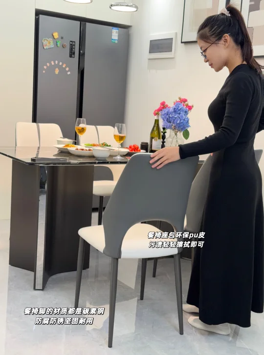 🌟餐椅:餐椅脚的材质都是碳素钢 防腐防锈坚固耐用 餐椅座包环保pu皮 污渍轻轻擦拭即可