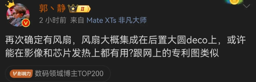 昨天看到一数码大V发了一条动态,说mate80是配有风冷散热的,风冷散热的部件是放在后摄像头星环位置,前段时间网上所爆出来的专利图一样。