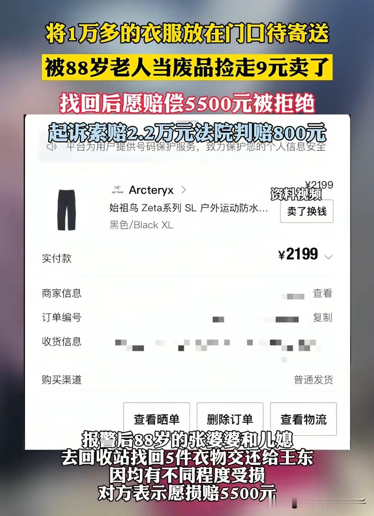 亏大了!四川,男子双十一网购的始祖鸟衣服,因尺码不合适,便将衣服打包放到门口,等快递员上门取,没想到却被邻居家老人当废品捡走了,总价1.5万的衣服一共才卖了9元。 知晓情况后的老人家属也不好意思,赶紧带着老人去回收站找回了包裹,但衣服都已经被弄脏了。 于是男子提出赔偿8000元,但老人家属觉得贵了,虽然衣服有破损,但想着大家都是邻居,便提出可以赔偿男子5500元,希望男子能原谅老人这次。 男子对邻居还价的行为挺生气,于是起诉了老人一家,要求赔衣物损失和抚慰金共2.2万元,万万没想到,法院最后竟然判老人赔偿了800元给男子! 结果下来男子傻眼了,邻居一家却笑了,当庭就通过微信把钱转给了男子,男子心里挺郁闷的,于是把事情发到了网上,想让网友评评理,大家觉得呢!