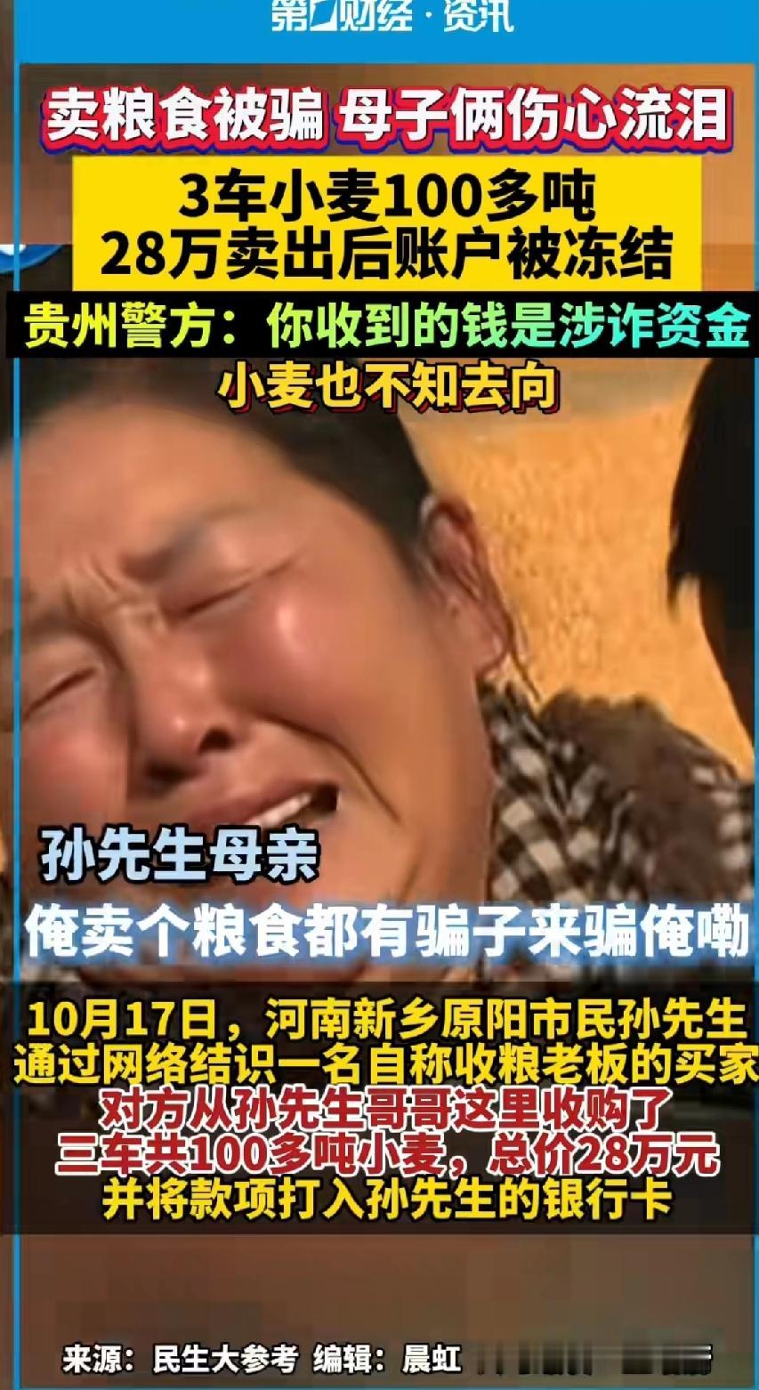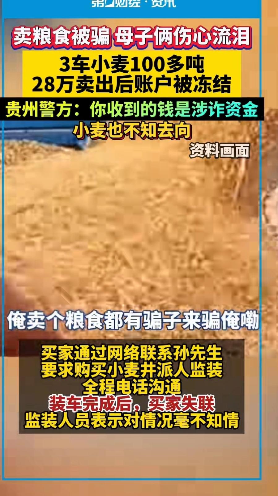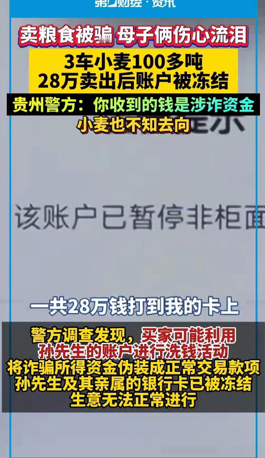 卖粮食被骗 母子俩伤心流泪,3车小麦100多吨,28万卖出后账户被冻结! 贵州警方:你收到的钱是涉资金,小麦也不知去向! 河南新乡原阳市民孙先生通过网络结识一名自称收粮食老板的买家。 对方称要买小麦并从孙先生哥哥这里收购了三车共100多吨小麦,买家派人监装全程电话沟通。 总价28万,并将款项打入孙先生的银行 装车完成后,买家失踪!监装人员表示对情况毫不知情。 警方调查发现,买家可能利用孙先生的账户进行洗钱活动,将诈骗所得钱财进行正常交易款项。 孙先生及亲属银行卡已被冻结,生意无法正常进行。 100吨小麦对于农民来说不是小钱,粮食钱都是辛苦钱。 从播种到收获,金钱上的投资和人力物力的投资,只有种过地的老百姓才能理解。 那么多小麦竟然消失的无影无踪,全程参与的人也不知道怎么回事?只查到的卖家收到的钱,警方还是要加大办案速度,早日查清楚骗子的行踪!还老百姓的血汗钱。