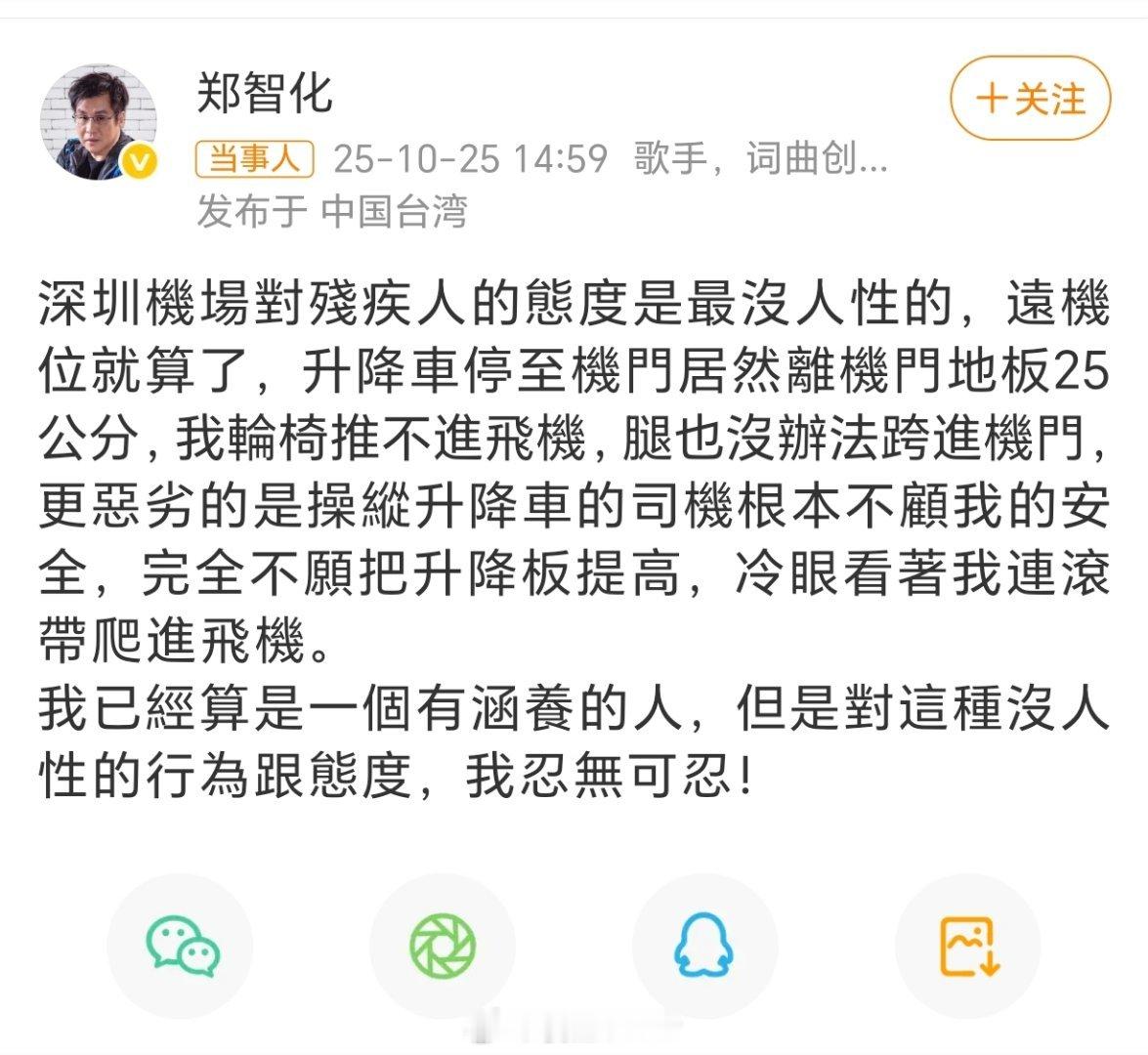 郑智化连滚带爬进飞机歌手郑智化发文批评深圳机场:深圳机场对残疾人的态度是最没人性的,远机位就算了,升降车停至机门居然离机门地板25公分,我轮椅推不进飞机,腿也没办法跨进机门,更恶劣的是操纵升降车的司机根本不顾我的安全,完全不愿把升降板提高,冷眼看着我连滚带爬进飞机。
