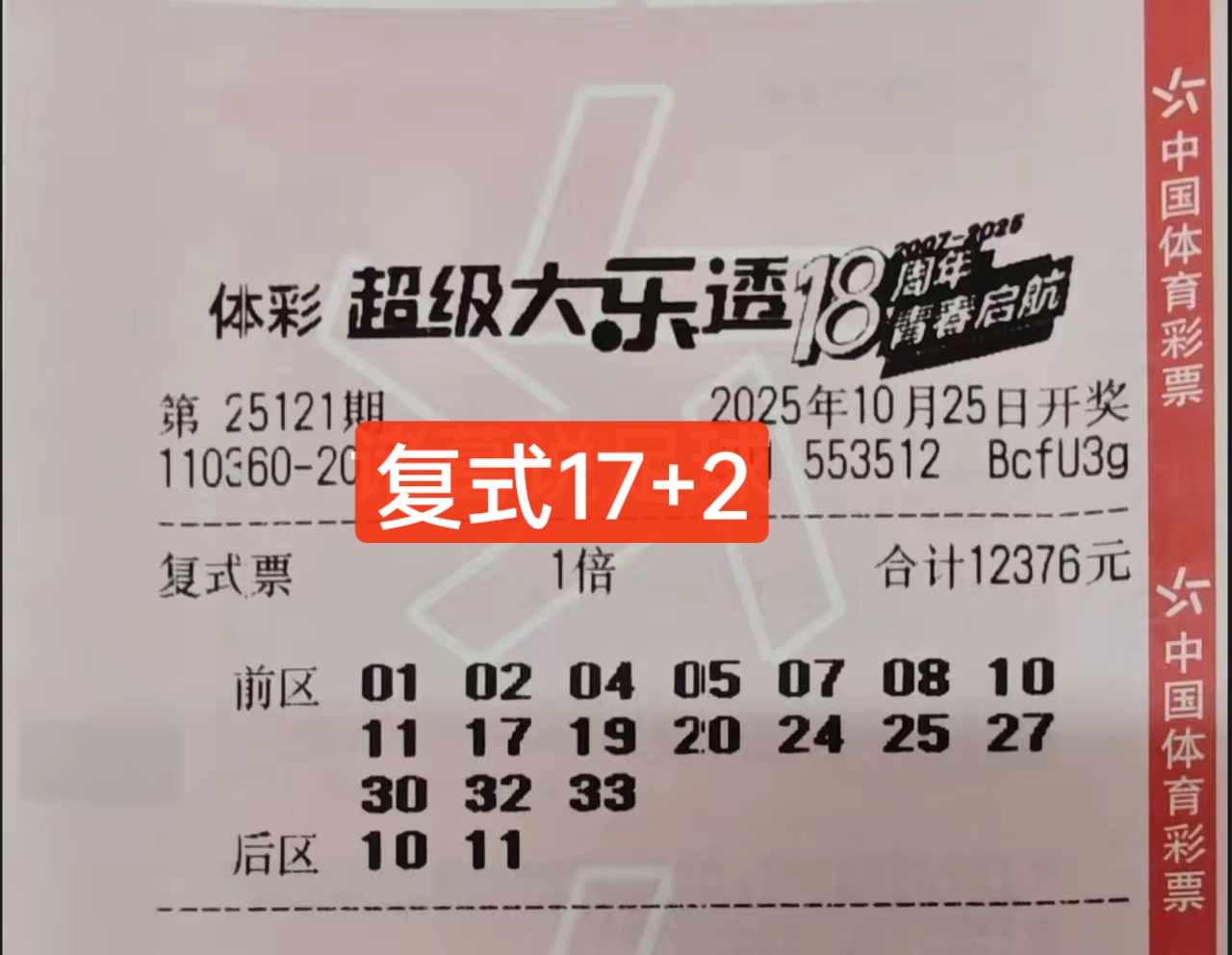 大乐透25121期晒票 (1)前区2胆19拖,后区1胆3拖。 此票号码涵盖率较高,相对的中奖的概率增加。 (2)大复试17+2,号码选择以两连号为主,没有选择3连号或者多连号,后区也是连号组合。此组合的选择方式比较独特,期待好运的眷顾!