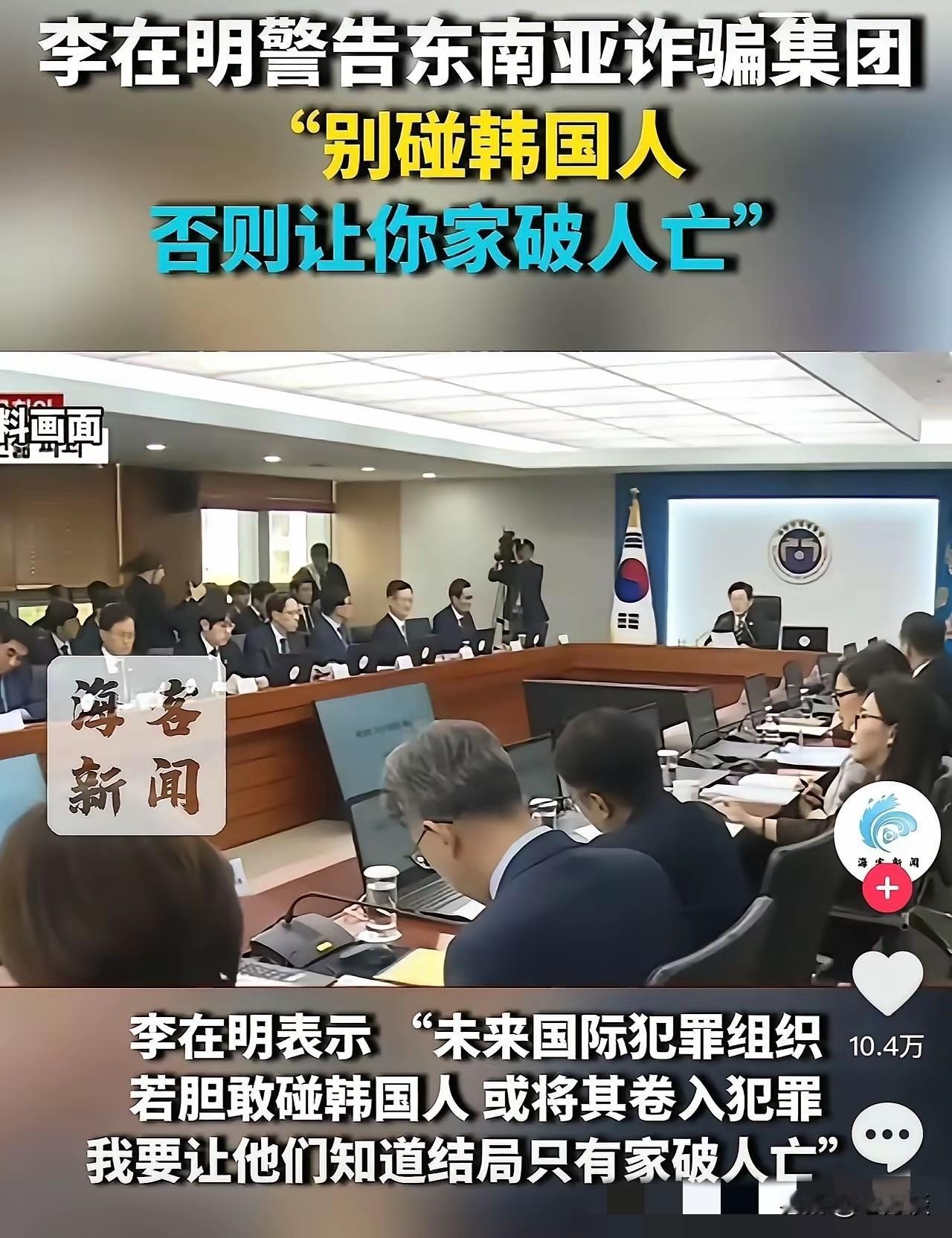 大韩民国真的是好大,韩国总统李在明喊话警告东南亚诈骗集团:别碰韩国人,否则让你家破人亡!虽然大家都知道韩国喊话一流,但是真正落实到位的却是寥寥无几!不过李在明这一嗓子,也可以把东南亚诈骗集团吓破了胆。毕竟他们没有实力跟大韩民国对抗,即使隔得很远,大韩民国一个飞毛腿过去,东南亚诈骗集团岂不灰飞烟灭!李在明这么大嗓门,这些诈骗集团应该都听到了,都吓得瑟瑟发抖不敢动了!