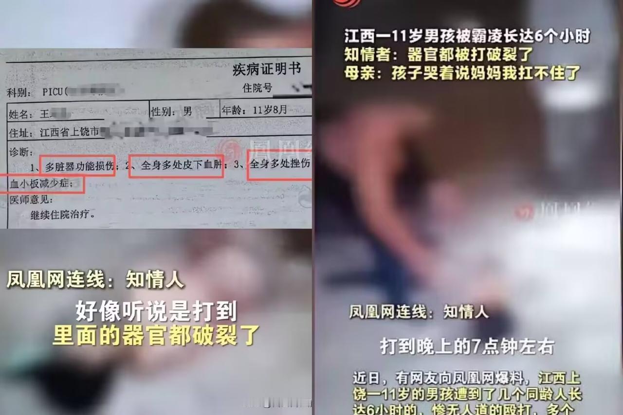 11岁孩子躺ICU里, 气若游丝喊“妈妈我想回家”,谁能想到,他身上的伤竟是同学连续6小时霸凌打出来的?! 江西上饶这事儿,看得人浑身发寒——这孩子多懂事啊,家里穷怕父母为难,长期被五六个同学欺负,愣是把“被打”说成“自己摔的”,直到被打得内脏破裂,才撑不住哭着说真相。 更让人火大的是,施暴者也是未成年人,下手却狠到没分寸,打完居然还能被轻易放出? 6小时的施暴,老师、学校真能完全不知情?所谓的校园守护,到底漏了多少窟窿? 别再用“年少无知”包庇恶了,孩子的命、碎掉的安全感,容不得半点敷衍! 你觉得该怎么让霸凌者付出代价?评论区一起顶起来