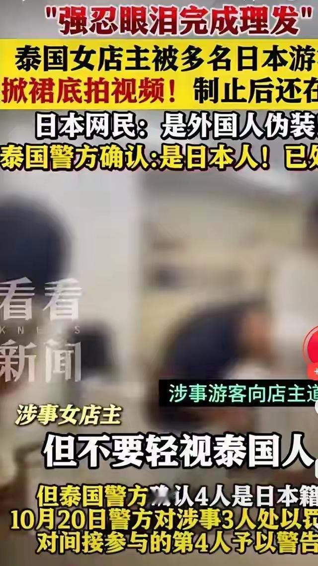 近日,4名日本籍游客在泰国一理发店理发时,其中3人毫无遮掩的对正在剪发的泰国女店主实施掀裙窥视,事发后遭女店主呵止报警。 事件视频在网上发出后,有日本网民狡辩称是外国人伪装成日本人,但泰国警方很快证实4人确系日本籍。 有网友说:有些人貌似彬彬有礼恭卑谦让,实则内心龌龊肮脏蝇营狗苟,这种人哪里都有只是或多或少的问题。 日本当年发动的侵略战争实施的三光政策。证明了如今日本人的虚伪! 那都有坏人和好人。强行,强奸似的决不是善良之辈。互利互惠,才是良民。 左宗棠对日本人的核心评论是:“知小礼而无大义,拘小节而无大德,重末节而轻廉耻,畏威而不怀德,强必盗寇,弱必卑伏。” 日本人是最会伪装的毒蛇,披着羊皮的狼,一但时机成熟,便会撕下伪装,露出獠牙,撕吃善良的羊 日本人到了不发达国家非常狂,非常傲,在它们自已国家装的有礼貌,懂规距,其实日本这个民族是最人面兽心的国家! 大家怎么看呢?