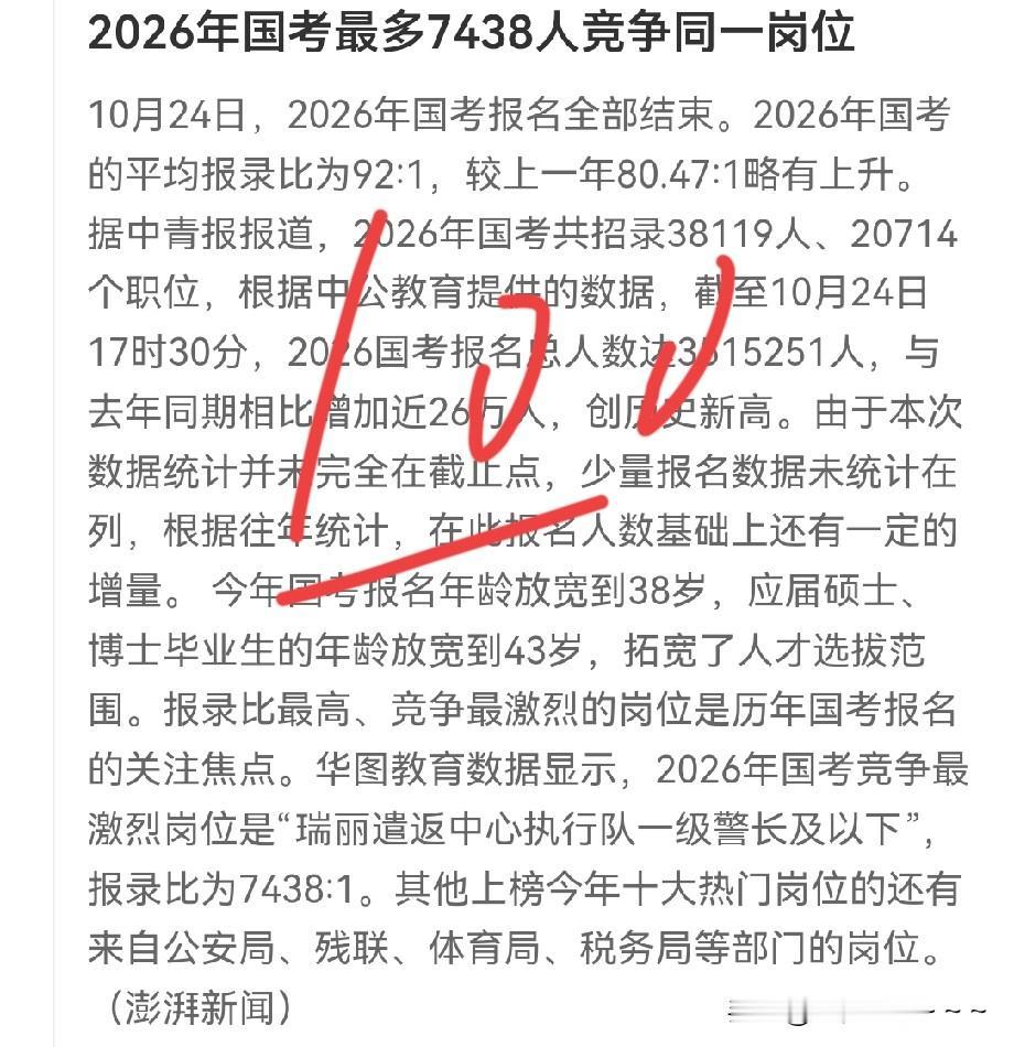 天呐! 2026年国考竞争激烈到7438人竞争一个岗位,真正到了万里挑一的时刻!