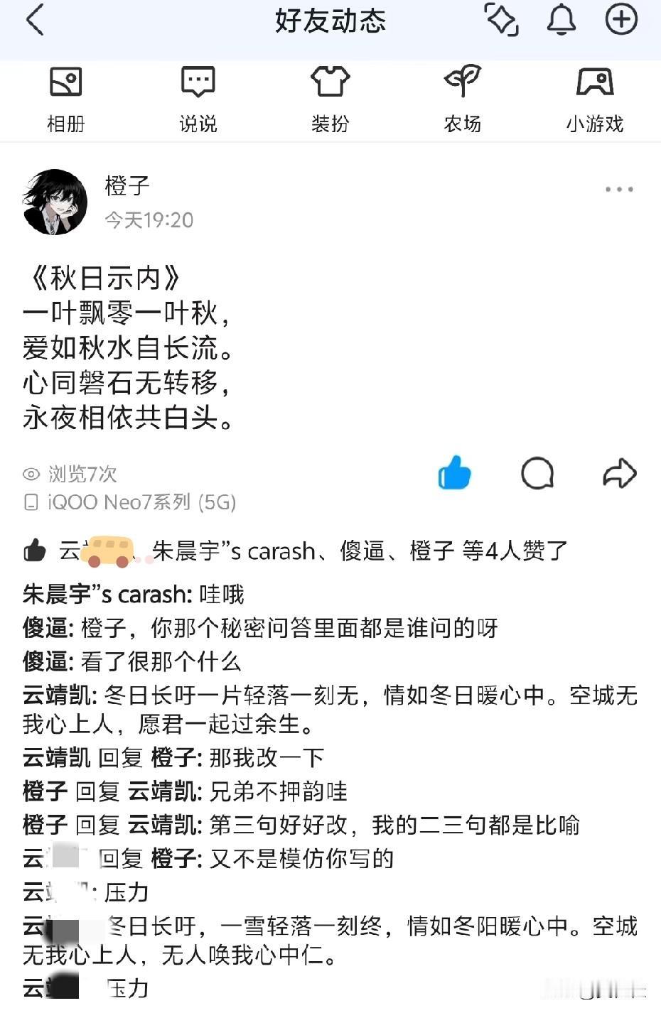 笑不活了!10后的初一学生开始斗诗了!我家娃在QQ空间跟同学“斗诗”,把我看乐了! 刚孩子给我看他和同学写的诗,好家伙,我很是惊呆!同学“橙子”先发了首《秋日示内》,对仗工整还挺浪漫,“爱如秋水自长流”直接给我看愣了——现在小孩都会写情诗了? 结果我家姓(云姓)秒接招,当场和了一首冬日版,就是韵脚有点“跑偏”,被同学吐槽“不押韵”。这小子嘴硬“又不是模仿你”,转头光速改了一版,还连刷两条“压力”,给我乐到拍腿。 现在的娃太会整活了,写诗跟聊天似的,评论区互相怼又互相捧,幼稚又可爱。 大家评评,是我孩子写的诗好,还是他同学写的好?