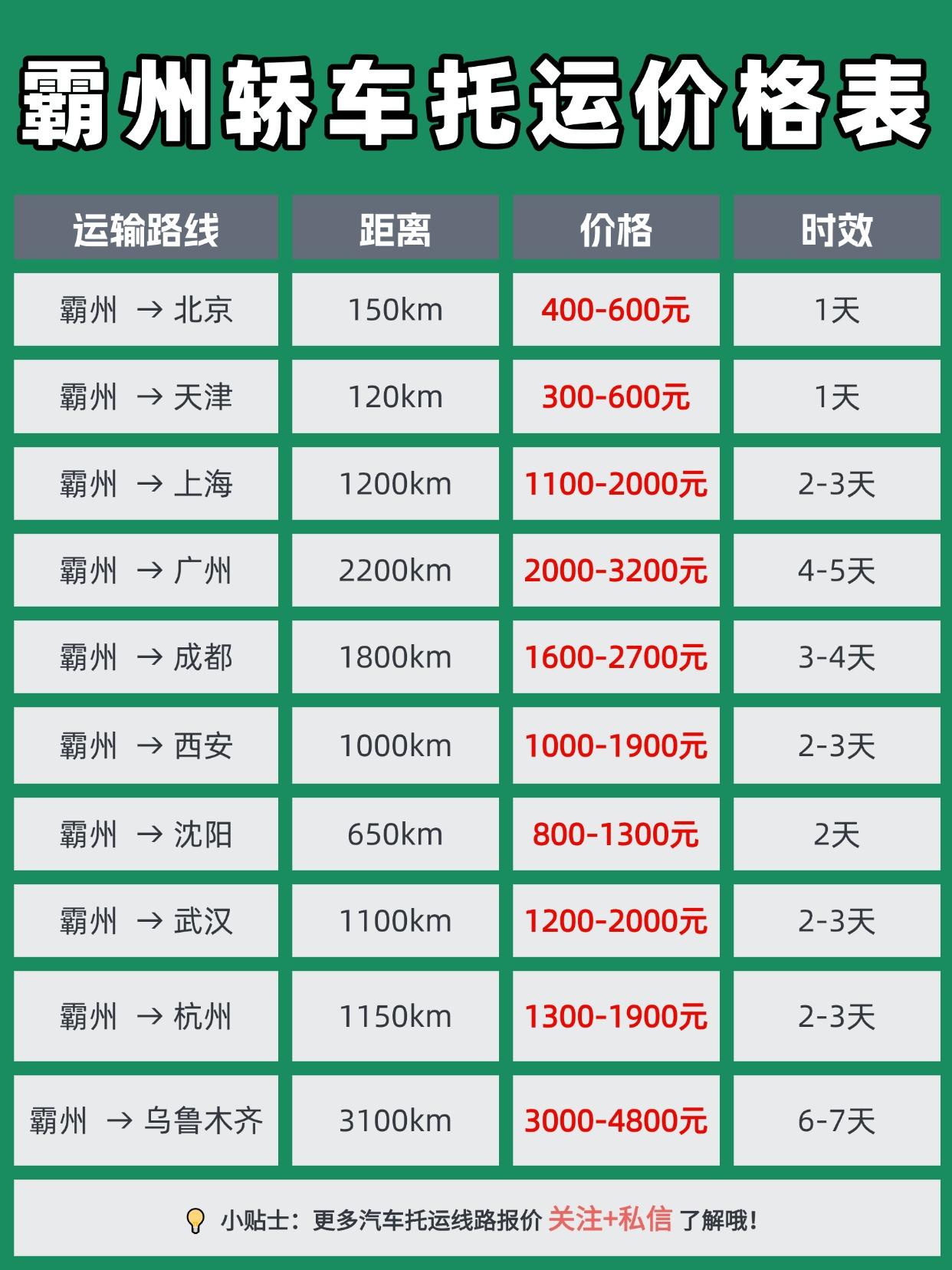 🔍 霸州发运收费标准区间 小型轿车:1.2元 - 2元/公里 (具体看线路和季节) SUV/大型车:1.5元 - 2.5元/公里 (比轿车贵200-800元不等) 时效参考:约 700公里/天 (偏远地区+1-2天) ⏳ 车辆运达后能停多久? 运达后一般免费停放 3天左右,超时按50-100元/天收费,取车前务必和物流点确认! 🚙 上门接送车免费吗? 部分区域免费! 霸州市区及近郊通常不收接送费(15公里内),超范围或跨城接送需加收200-500元服务费,下单前记得问清楚~ 📝 托运小贴士 比价要全面:别只看低价!查公司资质(营业执照+道路运输证) 合同仔细看:确认保额、费用明细、免责条款 验车要录像:交车前360度拍视频,避免纠纷