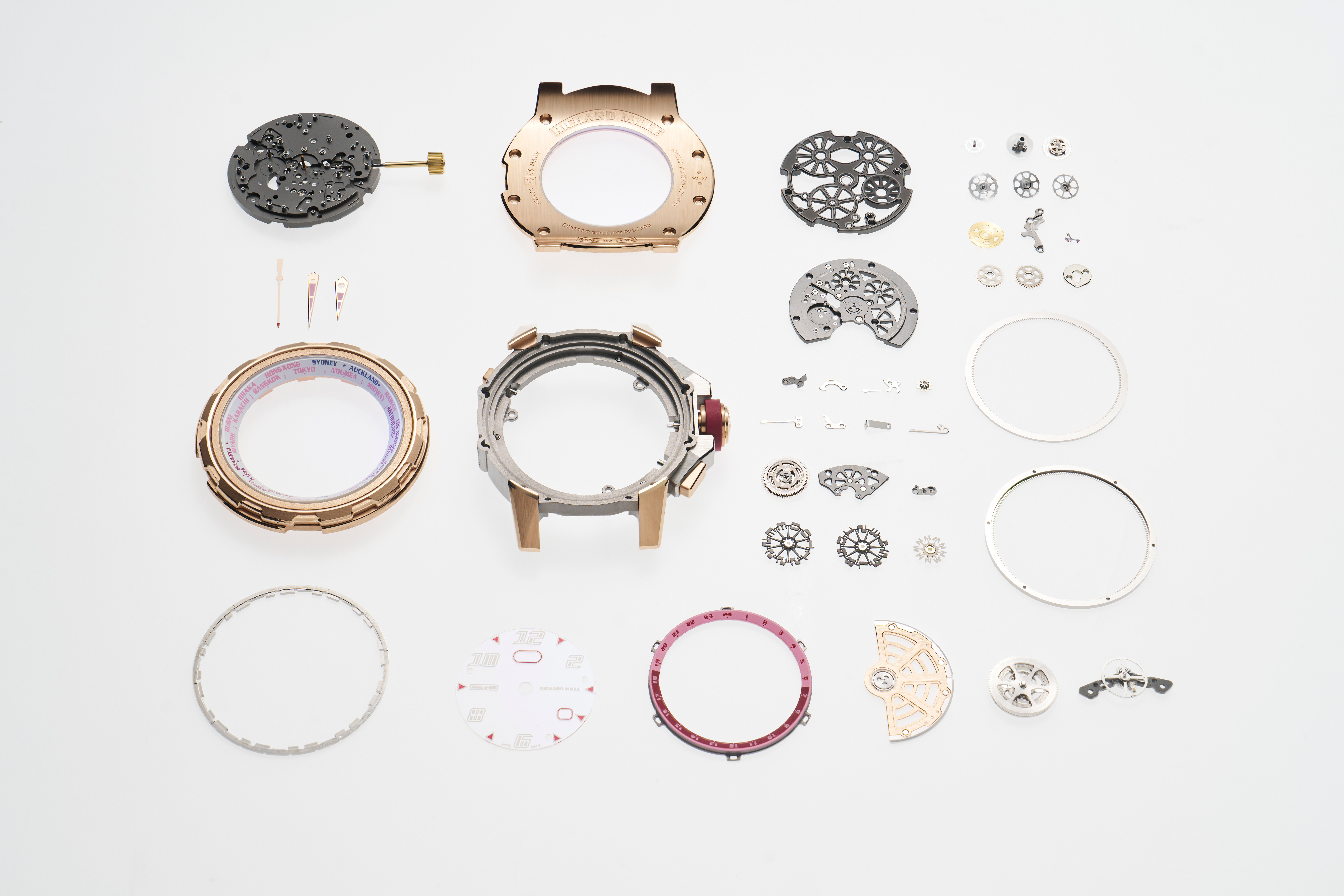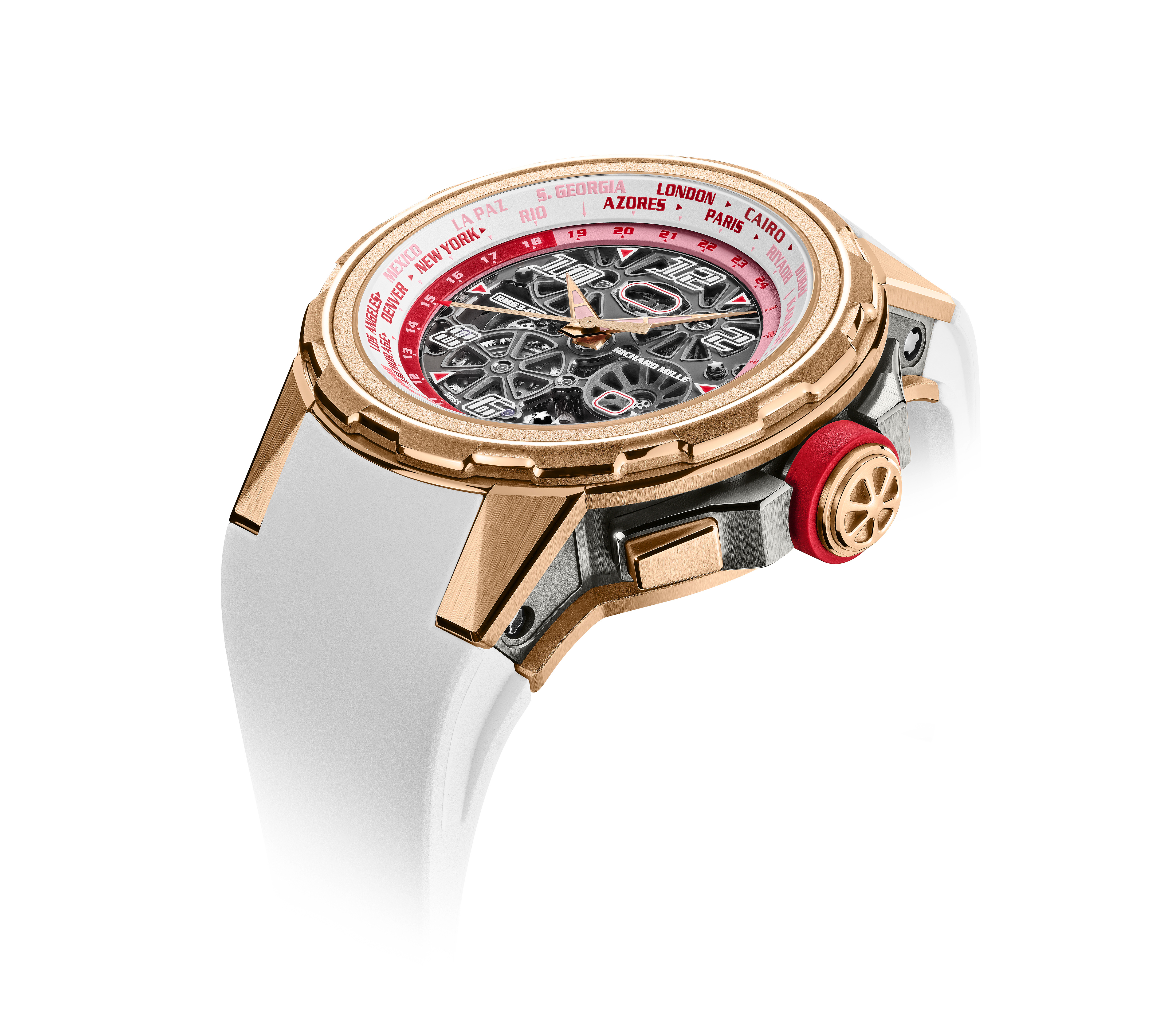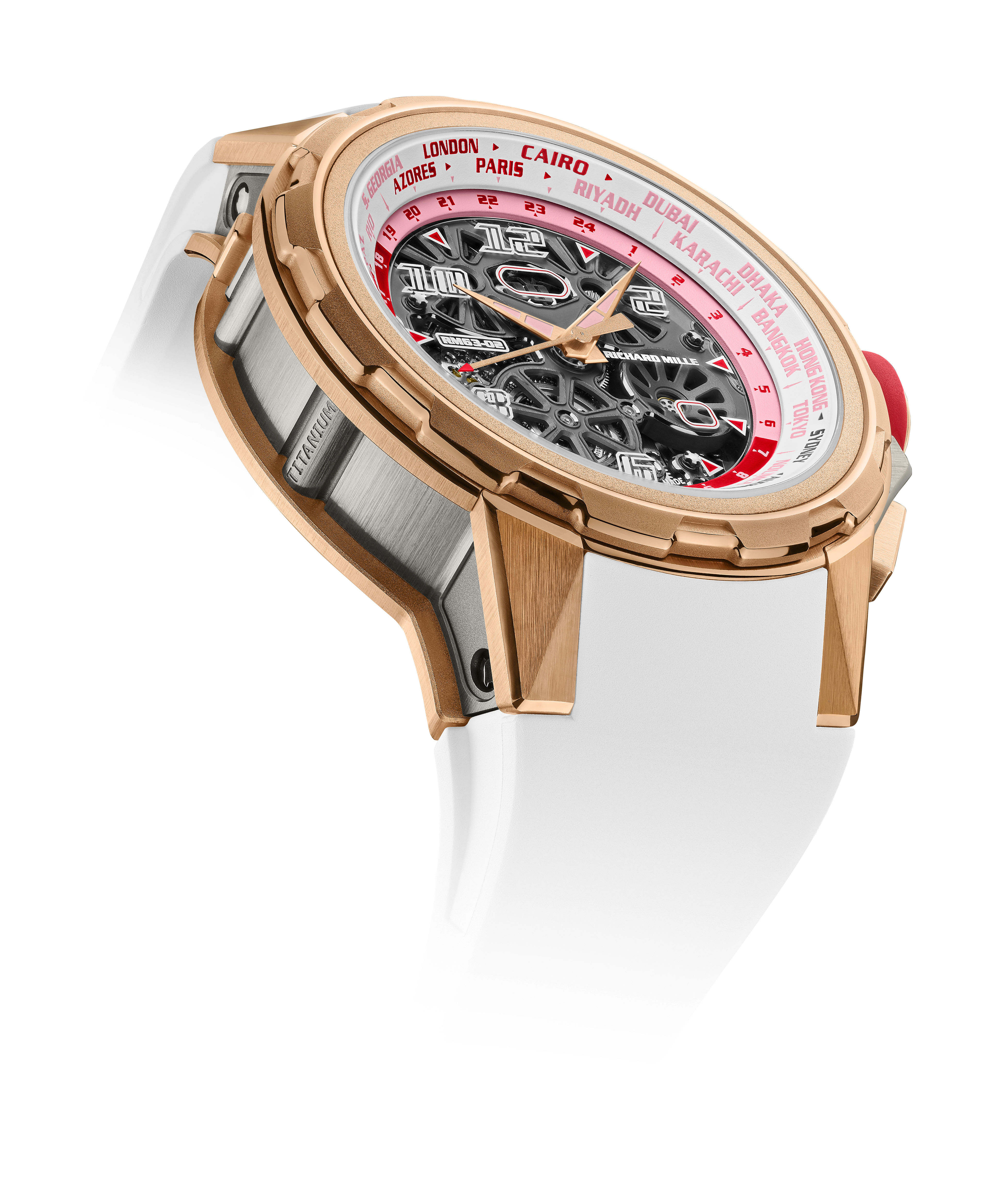 圆形的RICHARD MILLE你喜欢吗?这款RM 63-02世界时自动上链腕表全球限量100枚,拥有5N红金与钛合金锻造的优雅表壳,直径47毫米、厚度13.45毫米,搭载品牌自主研发CRMA4机芯,30米防水。