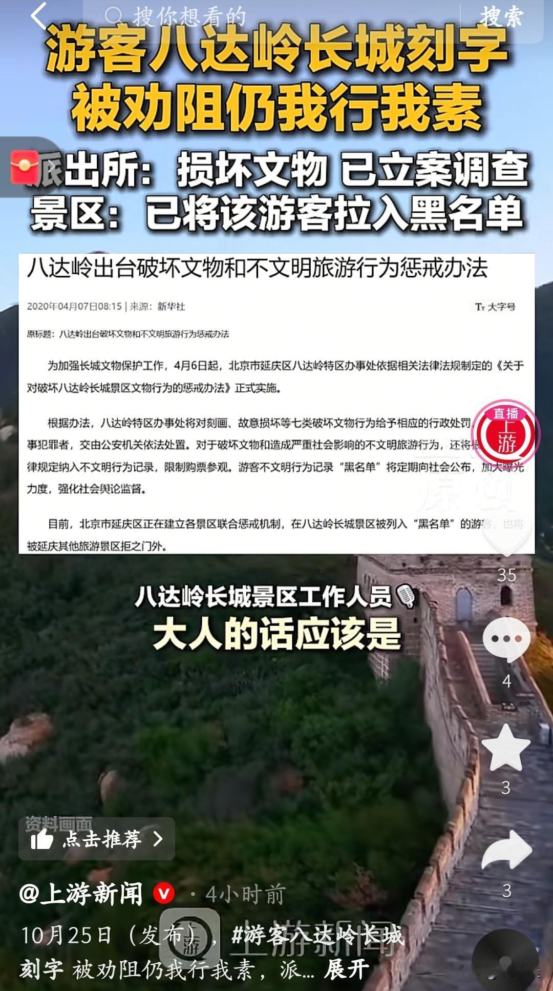 又有人在八达岭长城刻字了!10月24日中午,有游客非要在城墙上划拉,旁人劝了还不停。派出所已经立案查损坏文物,景区直接把这人拉进黑名单,以后想来都没门儿。 长城不是自家墙,刻字不是“留纪念”,是糟践老祖宗的宝贝。都2025年了,出门玩别干这缺德事儿,真要留痕,拍张照不比刻字体面?