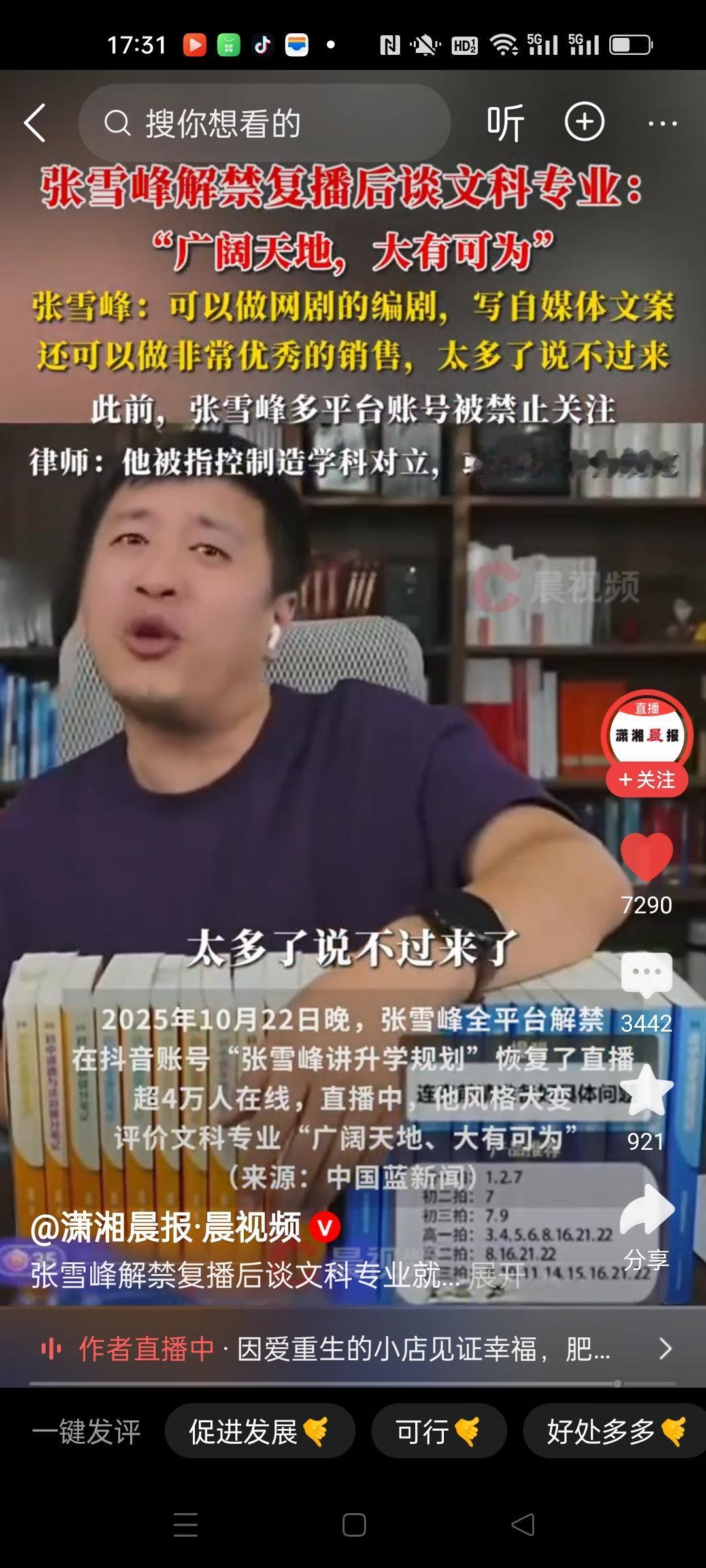 张雪峰复出啦,之前账号被禁止关注。 因为他之前在直播中被指控搞学科对立,现在重新开播又称赞文科大有前途。 其实这不是张雪峰第一次说话自相矛盾,填志愿,选学校,选专业这些都很让学生家长头疼,生怕选错了,耽误一辈子的前途。 张雪峰这方面确实有过人之处,但是我觉得他收费几万到十几万也太贵了。 我姑娘也是今年高考,她选学校,还是要看考的分数决定。只够二本,那怎么也上不了一本,也不会去上专科。所以只能在二本大学里面选。 所以我觉得一切都是分数决定的!