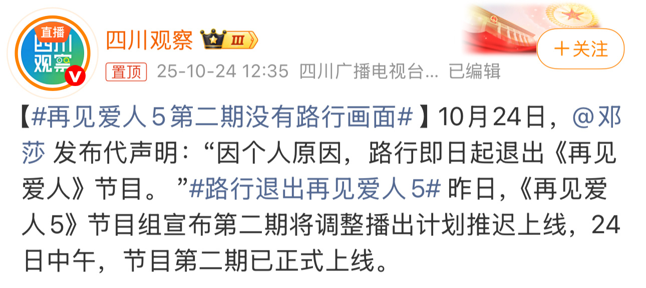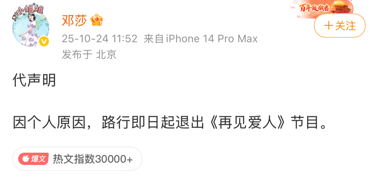 10月24日,邓莎代老公路行声明退出《再见爱人5》。