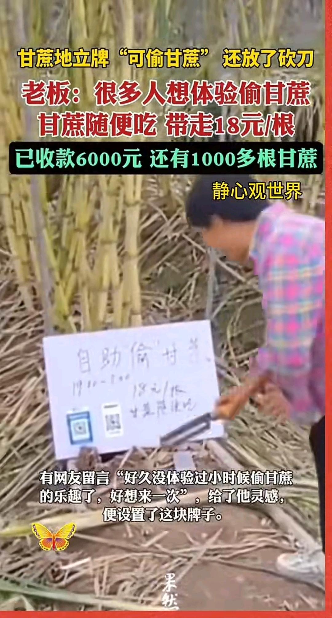 细思极恐 你的童年记忆被利用了 这可不是偷甘蔗那么简单 甘蔗地立块“可偷甘蔗”的牌 还摆着砍刀任人用 听着像圆了成年人的童年梦 实则是把情怀当生意宰 老板说看网友怀念小时候偷甘蔗 才想出这招 可明眼人一看就懂 这哪是怀旧 是精准拿捏了成年人的情感软肋 小时候偷甘蔗怕被追着骂 那是藏在心里的小刺激 现在光明正大“偷” 还得掏18块钱一根 这哪是体验乐趣 是花钱买个怀旧的名头 嘴上喊着“随便吃” 真要带走就得掏钱 已收的6000块 还有那1000多根没卖的甘蔗 全是用“童年记忆”堆出来的利润 有人觉得新鲜愿意买单 可仔细想想 当小时候的小调皮 被明码标价变成生意 那些纯粹的快乐 是不是也变了味 不是说不能做情怀生意 可打着“偷甘蔗”的旗号 把回忆拆成零件卖 总让人觉得心里不是滋味 你们说 花18块买根“偷来”的甘蔗 到底是圆了童年梦 还是被人用回忆当了冤大头呢