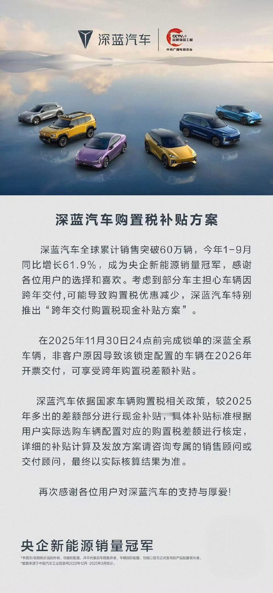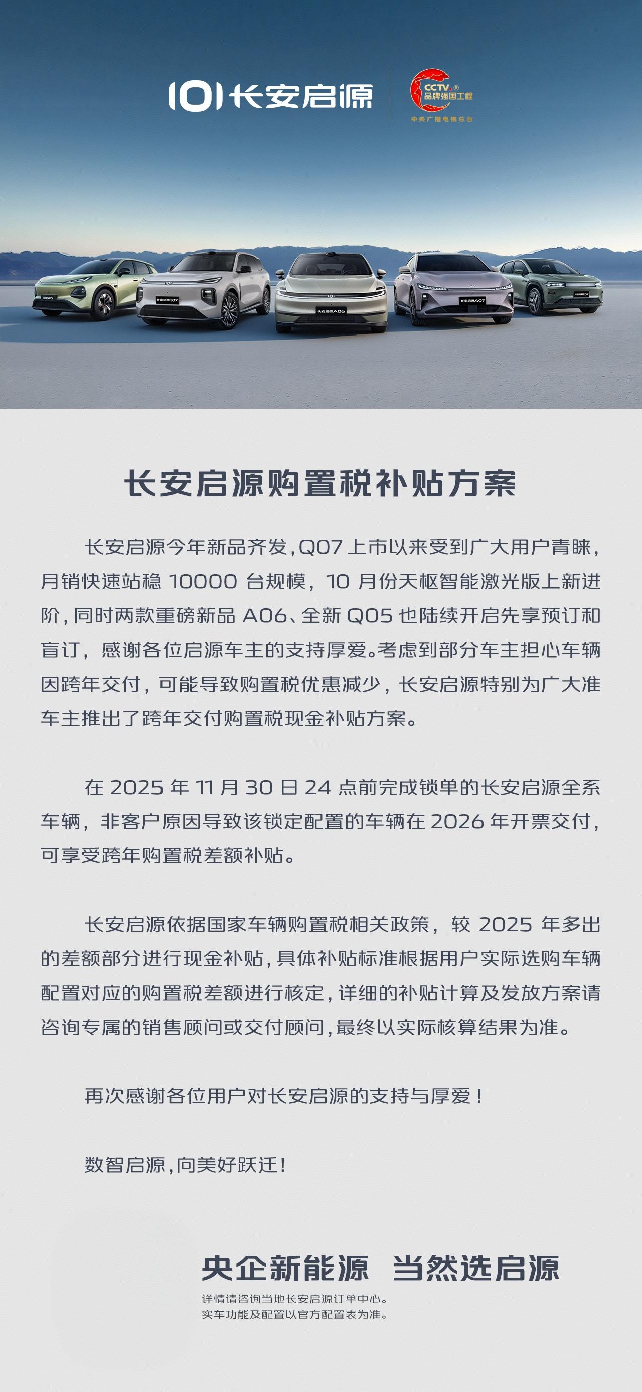 11月30日24点之前完成锁单的启源/深蓝全系车型,均能够享受跨年购置税差额补贴。 对于长安汽车来说,11月是尤其重要的,启源A06/启源Q05/深蓝L06/新款阿维塔12都会在这之前完成上市销售。这几款车型绝对算是今年年末甚至在未来很长时间的绝对销量主力,所以不容有失。 之前启源A06上市时间调整,很多消费者担心购置税问题,现在应该松了一口气。其实说起来越是这个时候,厂家同样非常的紧张,肯定想尽快把车交付给用户。 目前好像还没有看到阿维塔/长安引力相关的说明,是否也有用户担心呢? 深蓝汽车 长安汽车