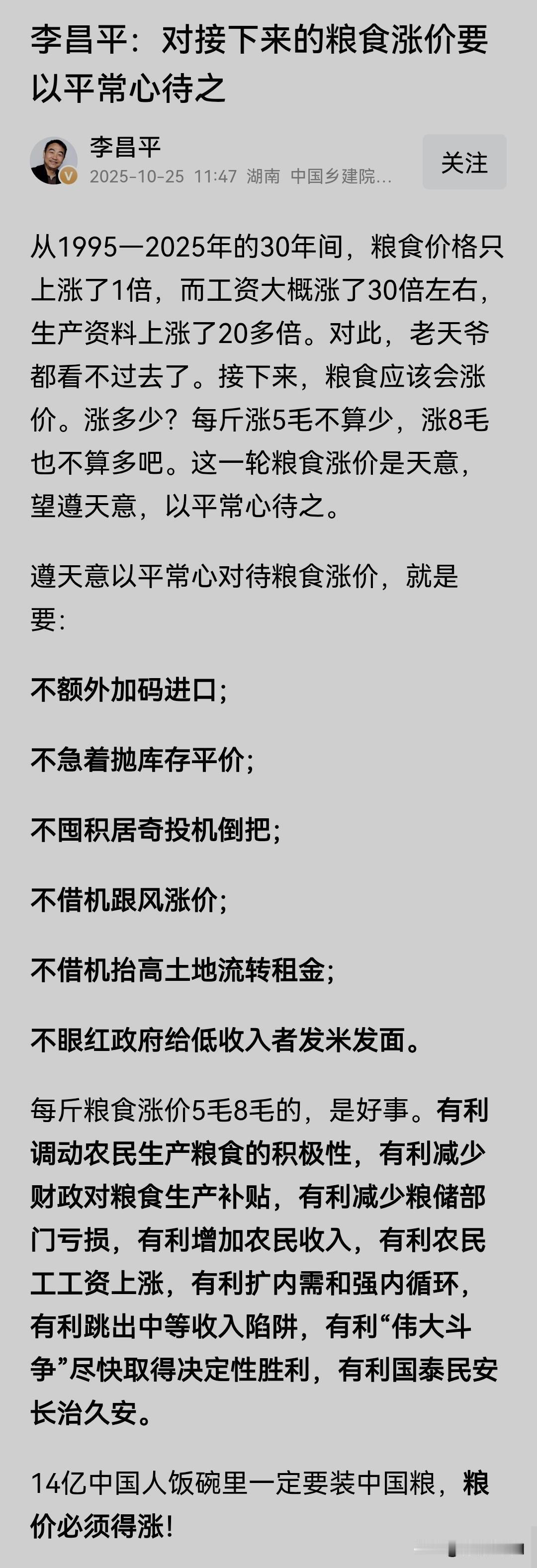 10月25日,李昌平发表文章称,30年间,粮食价格只上涨了1倍,而工资大概涨了30倍左右,生产资料上涨了20多倍。对此,老天爷都看不过去了。14亿中国人饭碗里一定要装中国粮,粮价必须得涨!这一轮粮食涨价是天意,望遵天意,以平常心待之。 对于中国乡建院院长、乡村建设协作者、优质三农领域创作者李昌平老师,我历来非常支持和尊重,但是,这一次对李昌平老师的观点不太赞成。 李昌平老师说,粮食必须得涨价,我们对粮食涨价要以平常心待之。但是,不知李昌平老师是否想到:虽然,谷贱伤农,但是,米贵却伤了民。不信走着看吧!粮食不涨价还好,若涨价,其他的副食品、工业产品、交通、水电气等等,一定都会全跟着涨。所以,粮食涨价,先吃不消的可能是全体老百姓,最后,传导到底端,吃亏的还是广大农民群众! 举例说明,前几年肉包子的价格是1元1个,当猪肉价格涨到20元一斤的时候,肉包子也涨到了1.5至2元一个。目前猪又跌价了10元左右,可包子的价格并没有落。假如粮食大幅度涨价,肉包子是否会卖到三元一个?普通老百姓吃个包子能吃得起吗?其实,粮食涨价对农民不一定有利,有利的商家和与农业相关的行业。