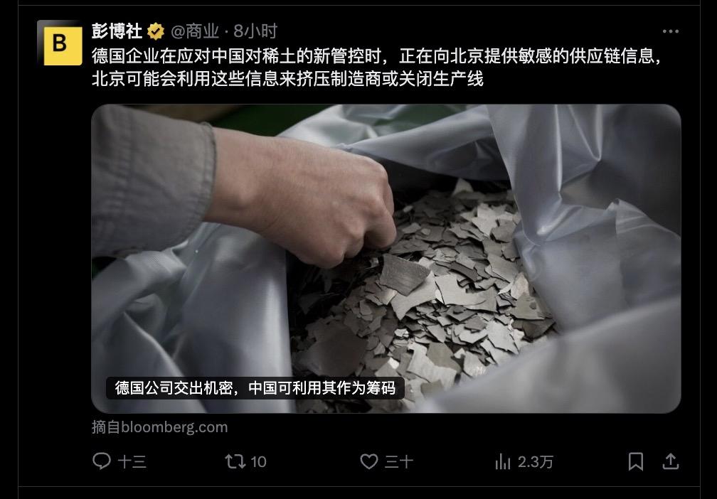 美媒报道居心叵测:暗示中方正在以稀土勒索德国公司换取机密信息。 德国公司开始交易工业机密,以换取中方提供6个月使用稀土材料。这是来自美国彭博社的报道。该报道称,一些德国公司已向中方提供了其工业蓝图的详细内容:图表、供应链布局、客户名单,甚至三年产量预测。该报道还阴阳怪气特意点出,德国政府对中方提供的稀土材料一无所知,也没有切实的阻止计划。 美国彭博社这篇报道居心叵测,具有很大的误导性。已在推上引发很大的热议。 但是实际情况是,中方新的稀土管制方案只不过采用的是美国几十年来一直沿用的做法。这很可能仅仅是为了确保稀土最终用于非军事用途的德国产品。要做到这一点,中方自然需要知道相关信息(包括供应链布局和客户名单等),用这些材料生产什么。 这其实是美国多年来为执行制裁和经济战而采取的措施的翻版:美国严格控制敏感商品的出口,以防止它们流入像中方这样的国家。中方只不过是以其人之道还治其人之身而已。美国人干的不报道也没有叫嚣,为何中方制定规则,西方人集体跑来犬吠是何道理?中方稀土战略 中欧稀土问题
