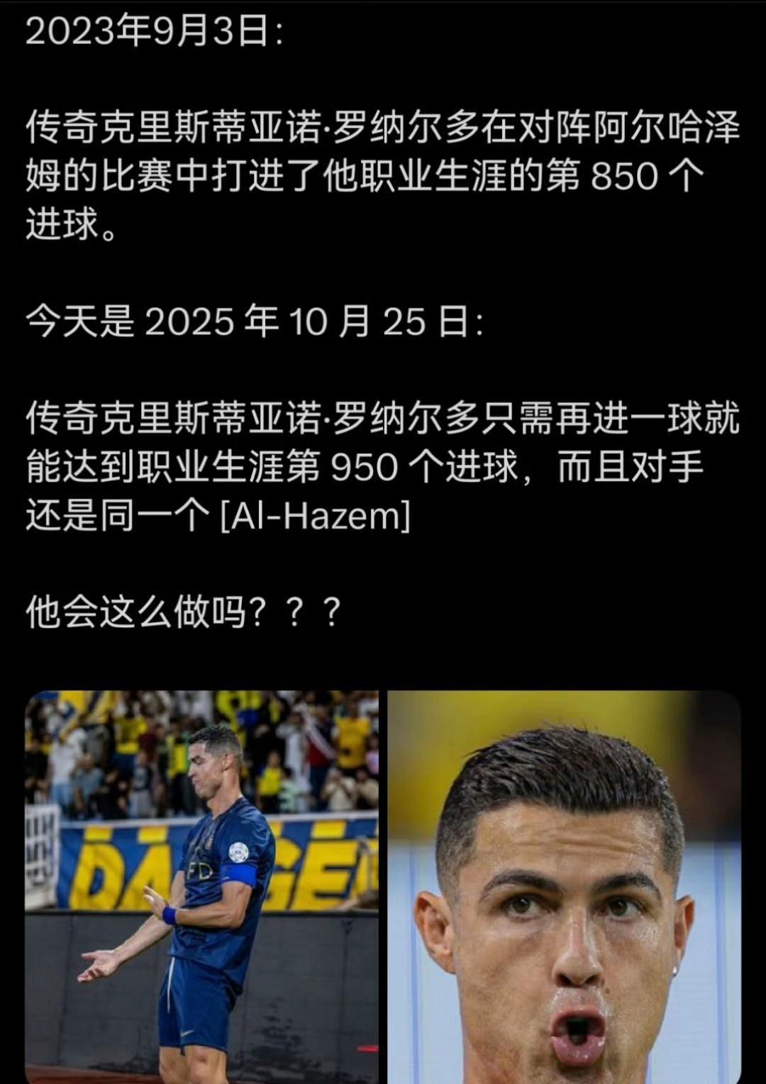 C罗950球如约而至!这场比赛很煎熬,但罗哥的进球解决一切! 沙特联第6轮,利雅得胜利2-0客场击败哈森姆,联赛继续全胜。菲利克斯、C罗各进1球。 第850球面对的对手也是哈森姆。C罗梅西这是在跟时间赛跑吧,一个950球、一个891球;一个续约到2027、一个续约到2028。