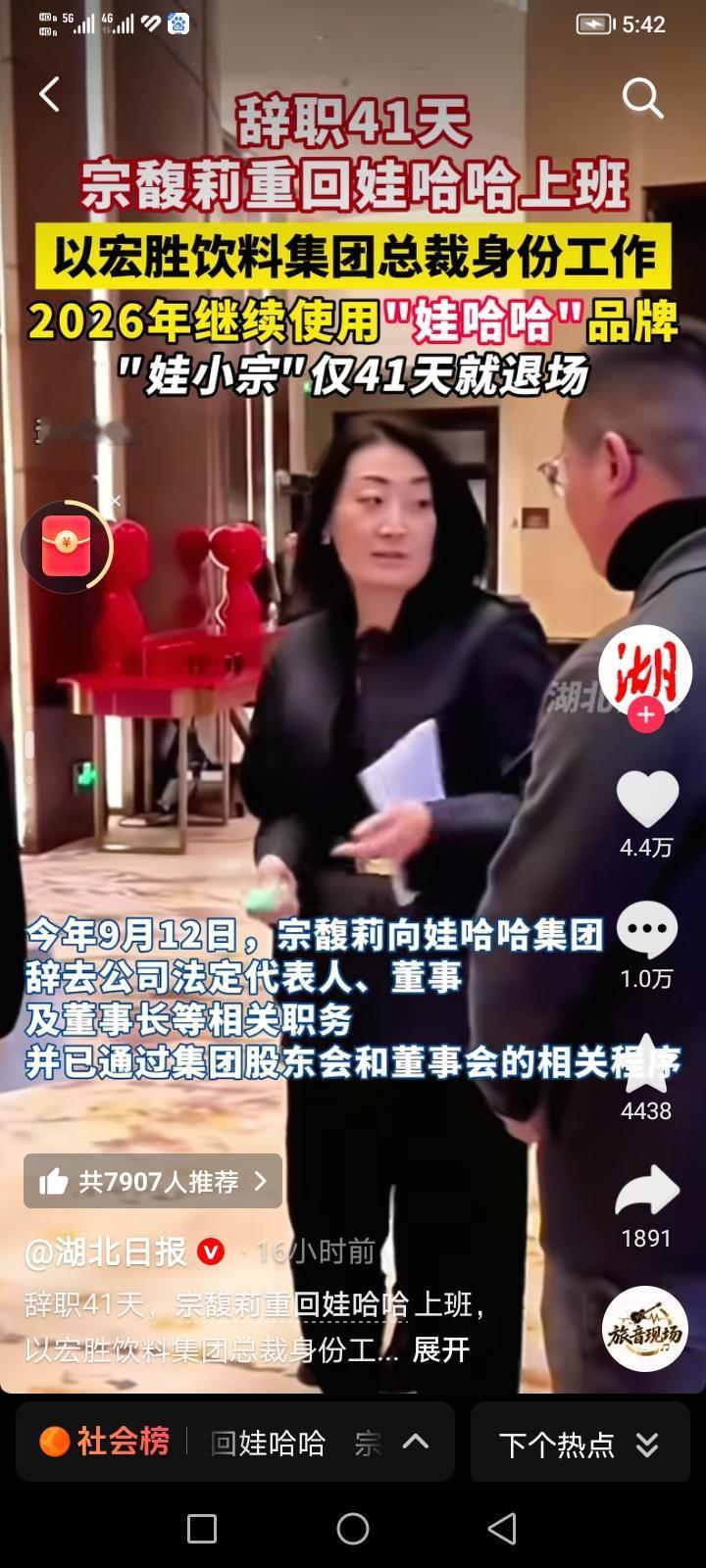 宗馥莉回宏胜集团工作任总裁,本是意料之中的事,必竟娃哈哈这么大一个公司要发展,不可能一直内斗下去。我在以前的文案中写过宗馥莉要想回娃哈哈,就看她能吐出多少利益。目前来看,宗馥莉肯定是妥协了一些的。由曾经的集团老总变成了如今的分公司老总,应该说一个天一个地,职级上降了,话语权低了,两者之间撬动的资源也不可同日而语,这把牌应该算宗馥莉输了。当然了,最感到憋屈的还是昔日的下属,成了如今的上司,昔日的法务总监成了集团总经理,这也是上城文旅的高明之处。一些期待宗馥莉推出“娃小宗”品牌的人,也可以歇了,没有这个品牌了。这事对宗馥莉名声上又是有打击的,毕竟当初那么多人期待“娃小宗”,如今说没又没了,这会让人感觉她这人说话做事不靠谱。(图片信息来源:@湖北日报)娃哈哈 宗馥莉 宗馥莉遗产争夺