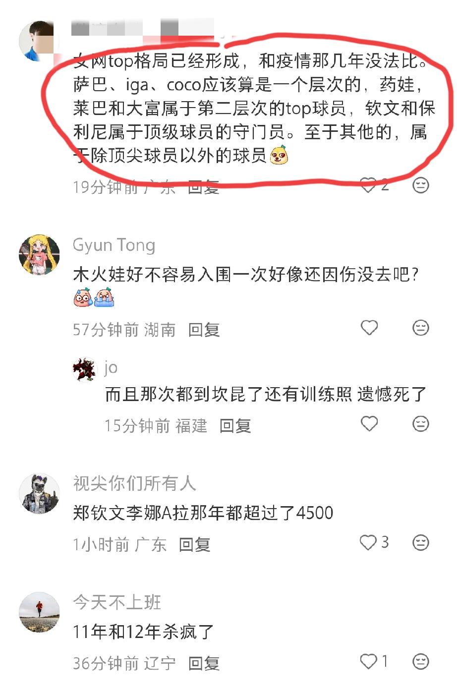 女子网球top格局已然形成? 有网友这样评价当下女子网坛的格局:女网top格局已经形成。萨巴、iga、coco应该算是一个层次的,药娃,莱巴和大富属于第二层次的top球员,钦文和保利尼属于顶级球员的守门员,至于其他的,属于除顶尖球员以外的球员! 这样的评价你认可吗? 而在我看来,萨巴、丝袜、高芙确实可以算第一层级的。第二层级我认为是药娃和小米辣,为什么把佩古拉和莱巴剔除掉,理由无非是佩古拉年岁渐长,今年能排名世界前八,明年就未必了,极大可能会掉出世界前八,而莱巴,影响她成绩提不上来的因素很多,比如教练,比如她的过敏症状,比如她前一段时间都打算退役了等等。莱巴排在第三层级勉强可以,而保利尼和郑钦文也进不了第三层级,保利尼也是因为岁数大了,郑钦文则是因为伤病和击球稳定性越来越差。 如果要我排,我会这样排: 1,萨巴、丝袜、高芙 2,小米辣、药娃 3,莱巴金娜 当然不排除像姆博科这样的后起之秀在未来几年内长期霸占世界前八的位置。 大家觉得呢?