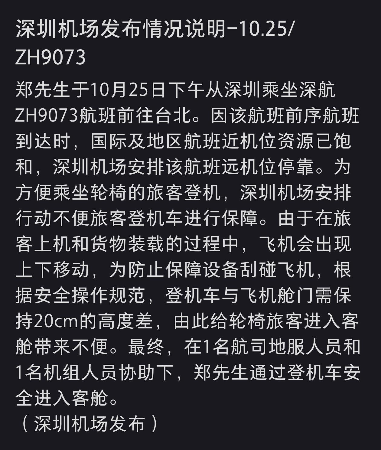 对于台湾歌手郑智化连滚带登机事件,深圳机场解释说明来了! 看了一下,主要是考虑飞机的安全。确保飞行安全固然重要,但如何把飞行安全和旅客的便捷度统一起来,确实值得研究和优化。