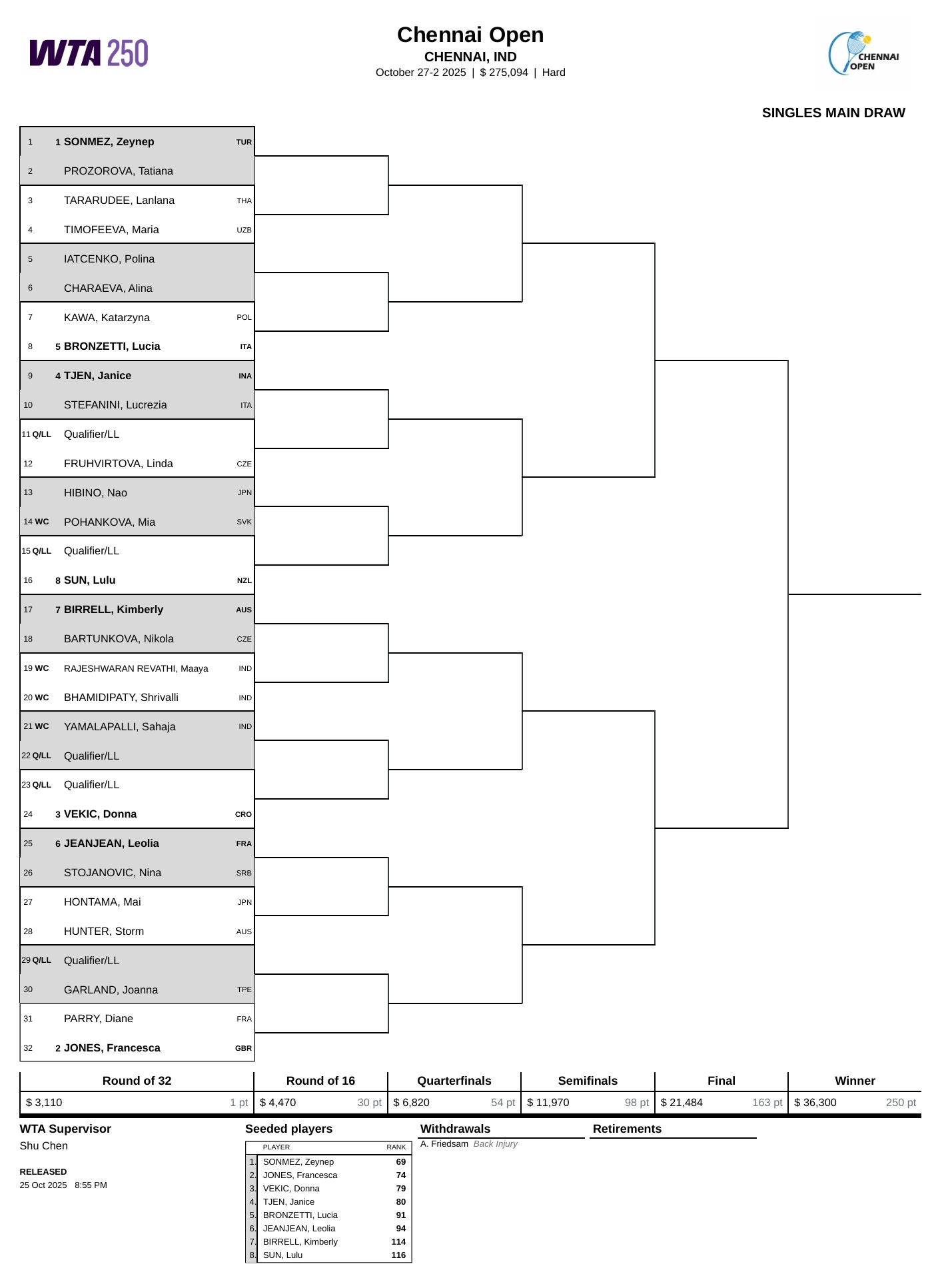 森梅兹、琼斯、维基奇、曾丽美、布朗泽蒂、让让、比勒尔和孙璐璐作为前八种子出战。