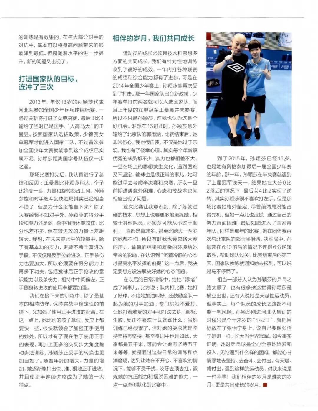 看到杨指笔下的孙颖莎,师徒的感情让人泪目。 亦师亦友亦父,字里行间都透露着他对莎莎的坚定,莎莎对乒乓球的热爱。 他说莎莎是千里马,得莎莎他此生荣幸。 这是多大的肯定和骄傲! 从十岁进入河北队,一开始并不是最出色的, 但杨指发现她是最努力的, 杨指说,有天赋,肯付出,遇到这样的运动员对于他来说,是一件幸事。 莎莎进入国家队的道路并不顺畅, 2013年,2014年,2015年 打了三年, 前两年,每一年都遇到了问题。 莎莎的成功,也得益于有一个好教练, 和他一起进退的教练, 失败了,我们一起承担, 一起找原因,并且很难得的是杨指会分析自己的问题, 他说是自己疏忽,自己大意, 没有关注她的心理变化,一直以为她会赢, 太侥幸, 以至于2014年16进8输掉比赛。 从此继续加强她的全面性,包括心理的磨练, 2015年打进国家队。 人生就是这样,遇到都是缘分, 只是这份缘, 能否长久,要看对彼此的认可, 还有一起的努力。 10年到15年,5年的朝夕相处,一起面对技术的困难,心理的困难, 一起去努力,去攻克。 带着莎莎全国各地的打比赛,找问题, 锻炼大赛经验。 15年进入国家队以后,莎莎这一路更难, 从二队到一队, 从有教练到百家饭,这段时间杨指进队陪伴。 这几年,无论多远,重要的比赛杨指都在, 他说技术上我帮不了她了,但是我在她会安心。 但是莎莎现在强大的正手, 完全得益于当年杨指坚定的正手框架, 否则很难有技术的改进和加强。 别人都问你飞得高不高, 貌似杨指每次见到她,都是问你饿不饿, 杨指的口袋里有糖,有小面包,随时都能变出来给她, 现在也变成了自己的孩子般去关心和爱护。 有的人一身本领,但却一生未遇到自己心仪的徒弟, 有的人天赋极高,但却没有遇到真心教授自己的师傅, 而莎莎和杨指,从遇到到现在, 都很坚定。 这其实是人生最开心的事情之一了。