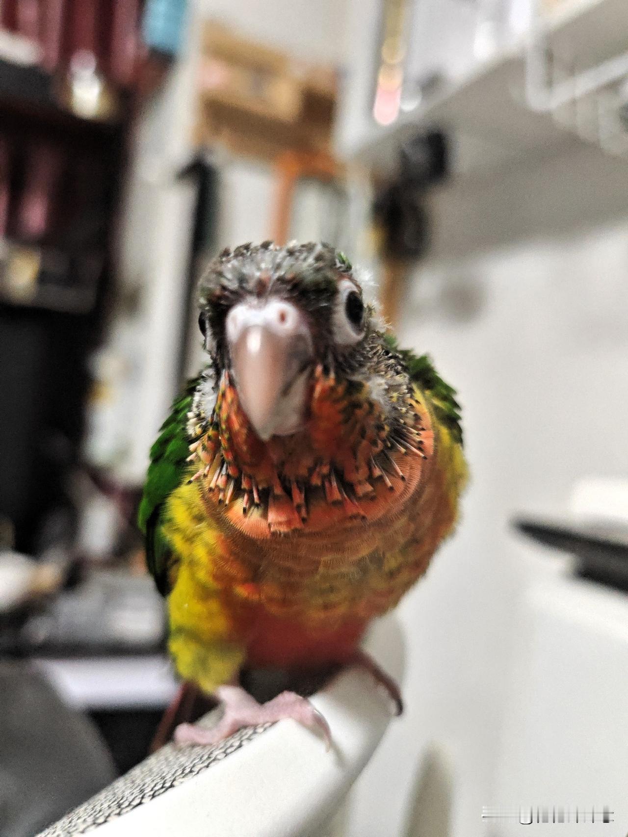 这是我家小太阳鹦鹉,毛还没长全,还是只幼鸟。它鸟特招人喜欢,性格活泼粘人,叫声不算吵,天天粘着我。 它毛色特鲜亮,绿翅膀、黄肚子、红脸蛋,长大更好看。缺点是嘴有点欠,爱啃东西,得给它准备磨嘴的玩具。 是挺有意思的小宠物,每天叽叽哇哇想说话