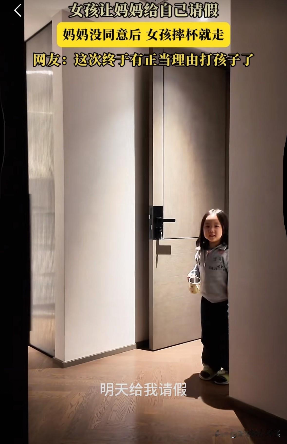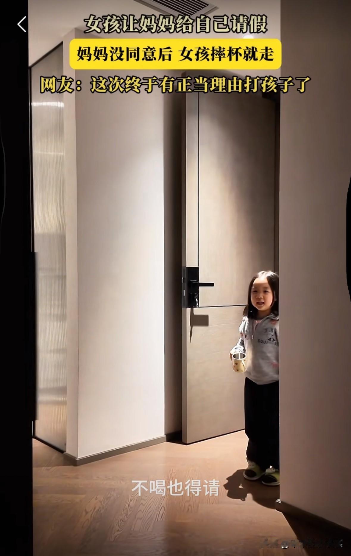 妈妈生病了想喝水,就让女儿倒杯水送来,小女孩开始谈条件了。 小朋友说:“明天给我请假!” 妈妈说:“水我不喝了” 女孩:“你不喝也得请!” 妈妈说:“不行!” 结果女孩直接把水杯扔在地板上,水洒的到处都是。 其实我想说,打孩子也挺解压的。这么小的年龄都会谈条件了,长大了还得了,所以教育孩子趁早。