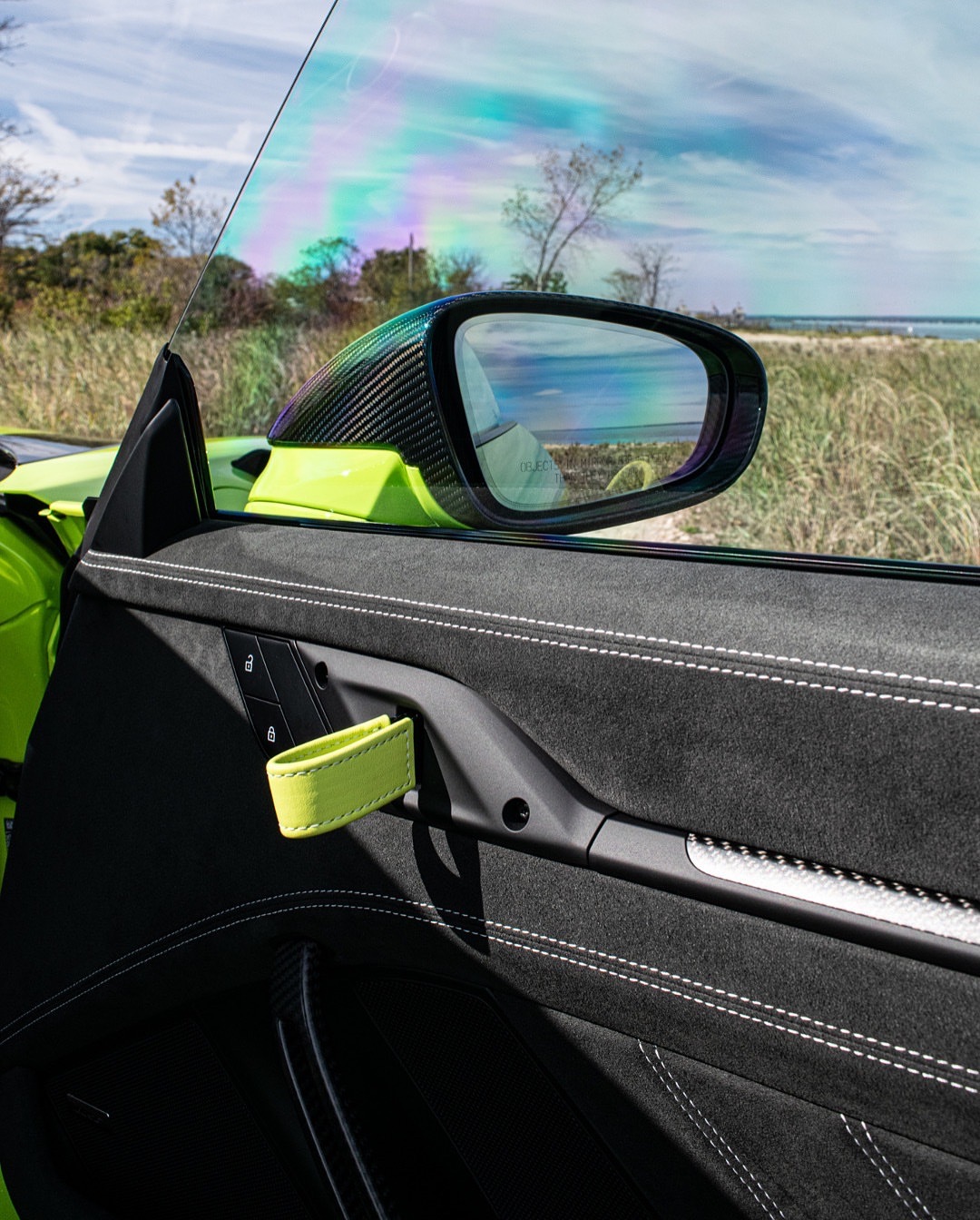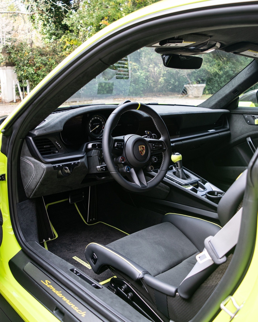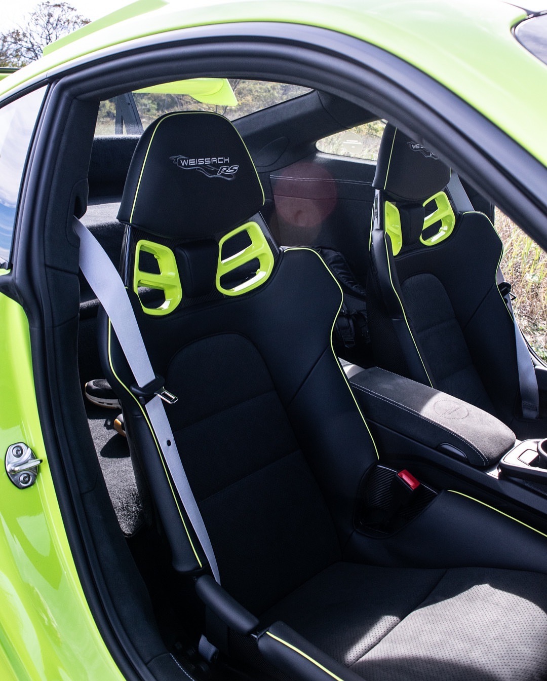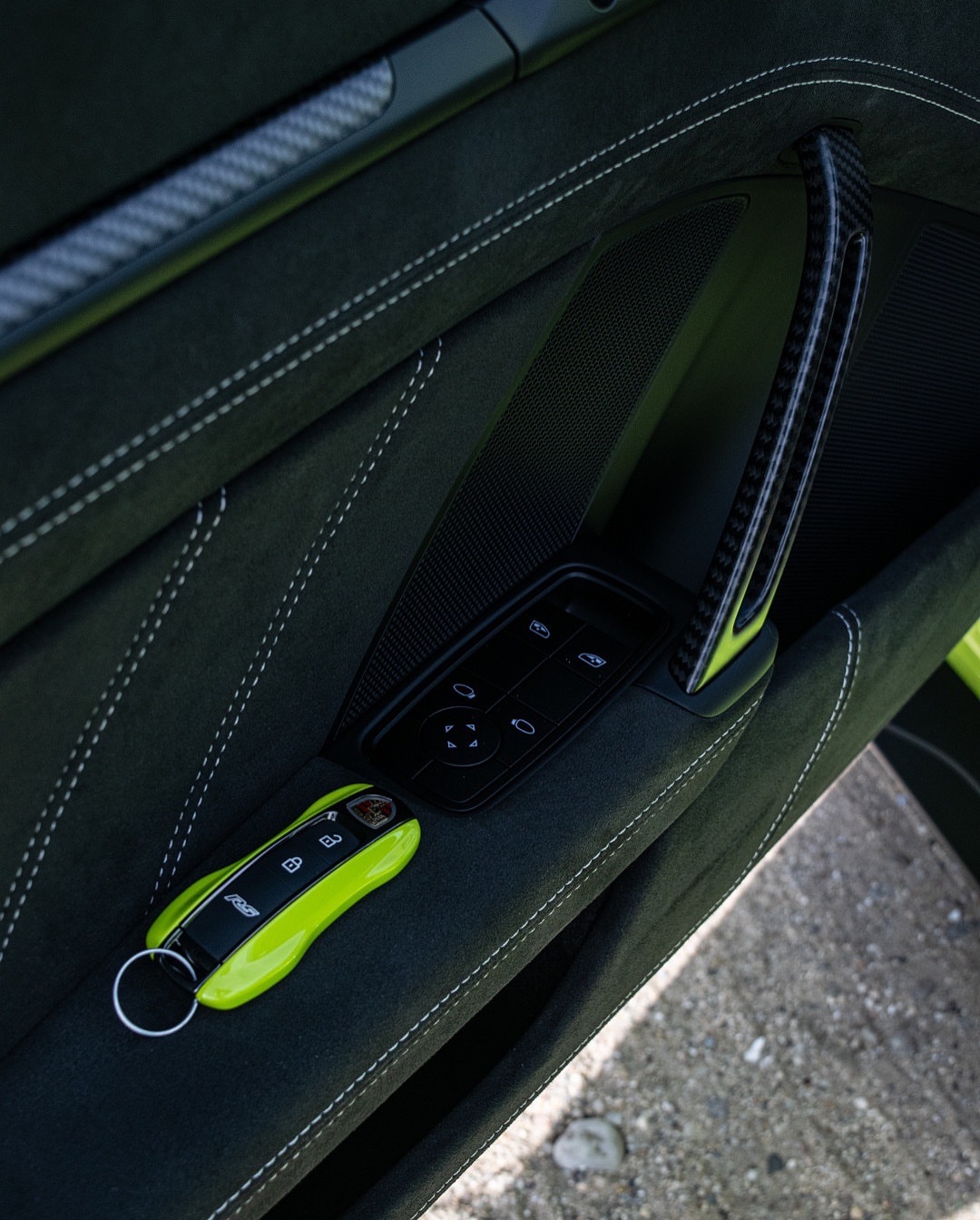 WeissachPackage的碳纤维车顶、前盖和挡风镜提供了有意的对比,而Sonderwunsch细节以AcidGreen延伸到前保险杠底部、车顶鳍、后翼端板,以及机翼上大面积的“PORSCHE”字样。磨砂黑色镁合金轮圈又增添了一丝专属的触感——中心锁扣盖上印有AcidGreen的“RS”标志。