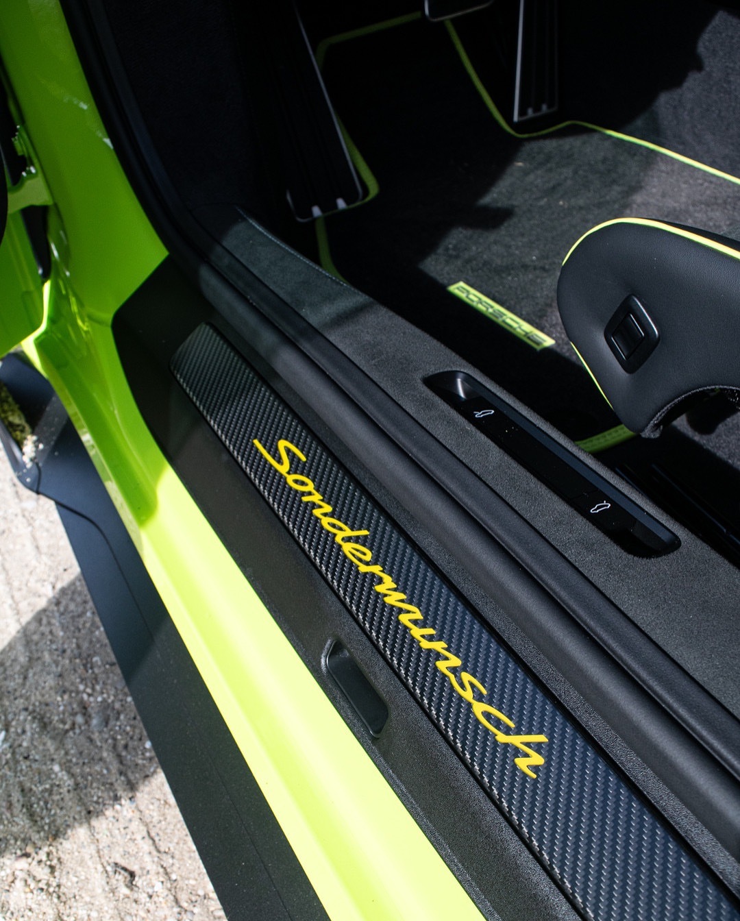 车内,鲜明的主题得以延续。AcidGreen的装饰线条沿着座椅穿过皮革管和座椅安全带插片,再次出现在方向盘的12点钟标记上,并突出了换挡杆和车门把手。这一外观由与地板垫和带有“Sonderwunsch”黄色字样的照明门槛板相匹配的对比色缝线完成。