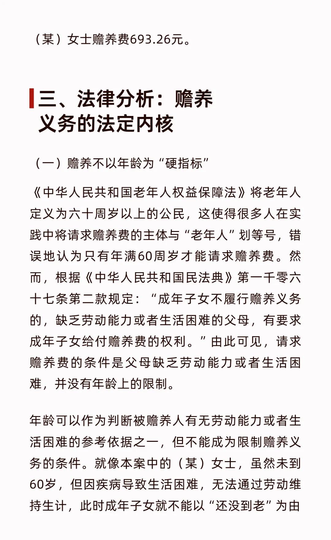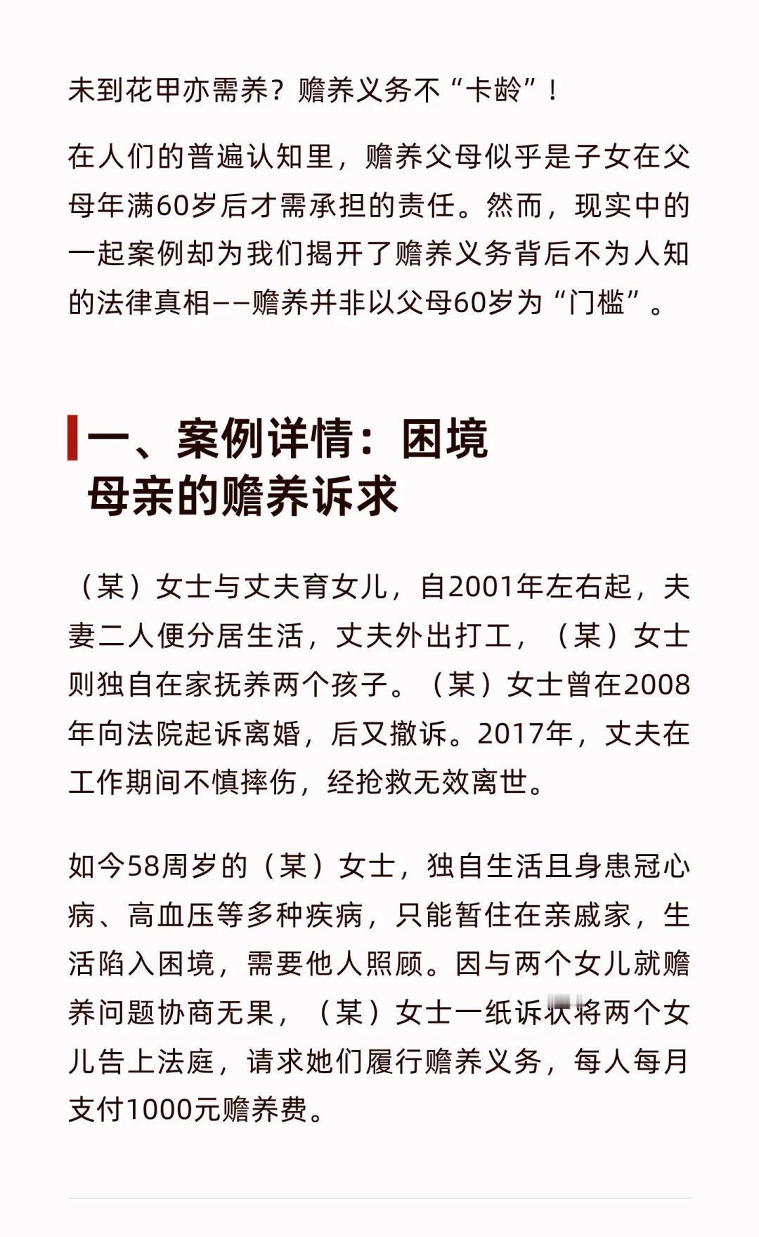 未到花甲亦需养?赡养义务不“卡龄”! 赡养义务不以年龄为限,父母因疾病或生活困难时,子女有法定赡养责任。案例中58岁的母亲因病需赡养,法院判决子女每月支付赡养费,强调赡养核心在于实际需求,而非年龄。 法律服务 律师咨询 律师 北京律师 法律咨询 赡养义务 赡养费 赡养纠纷 赡养费纠纷