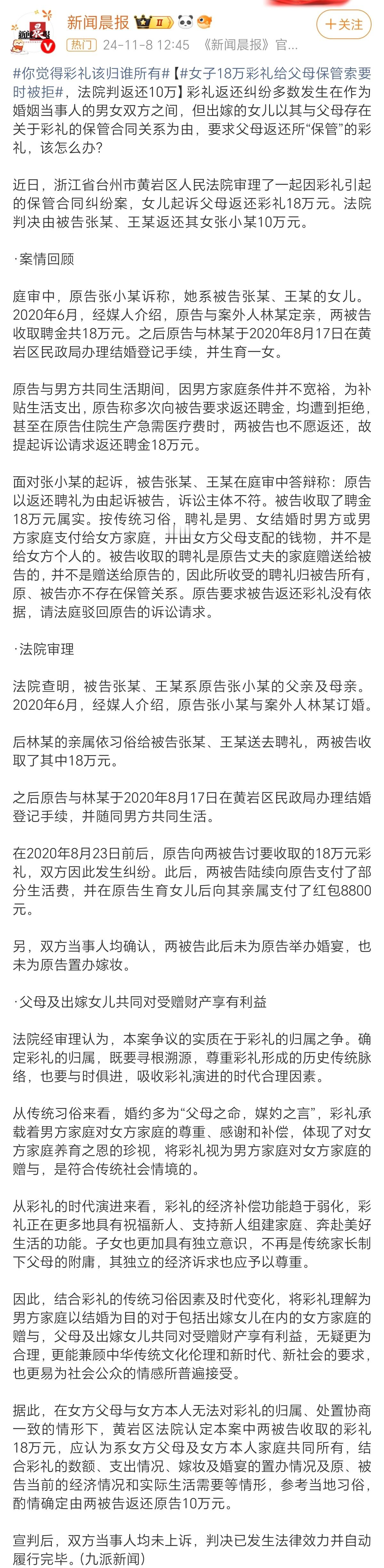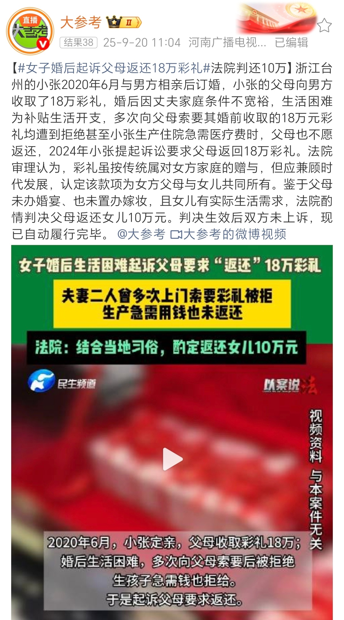 18万彩礼被扣下女儿起诉爸妈