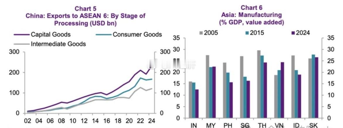 中国对东盟的出口结构揭示了其对亚洲新兴市场日益增强的产业控制力,2024年,中国对东盟六国的资本品出口已飙升至超2000亿美元,成为最大的出口类别,同时消费品和中间品出口也在迅速增长。