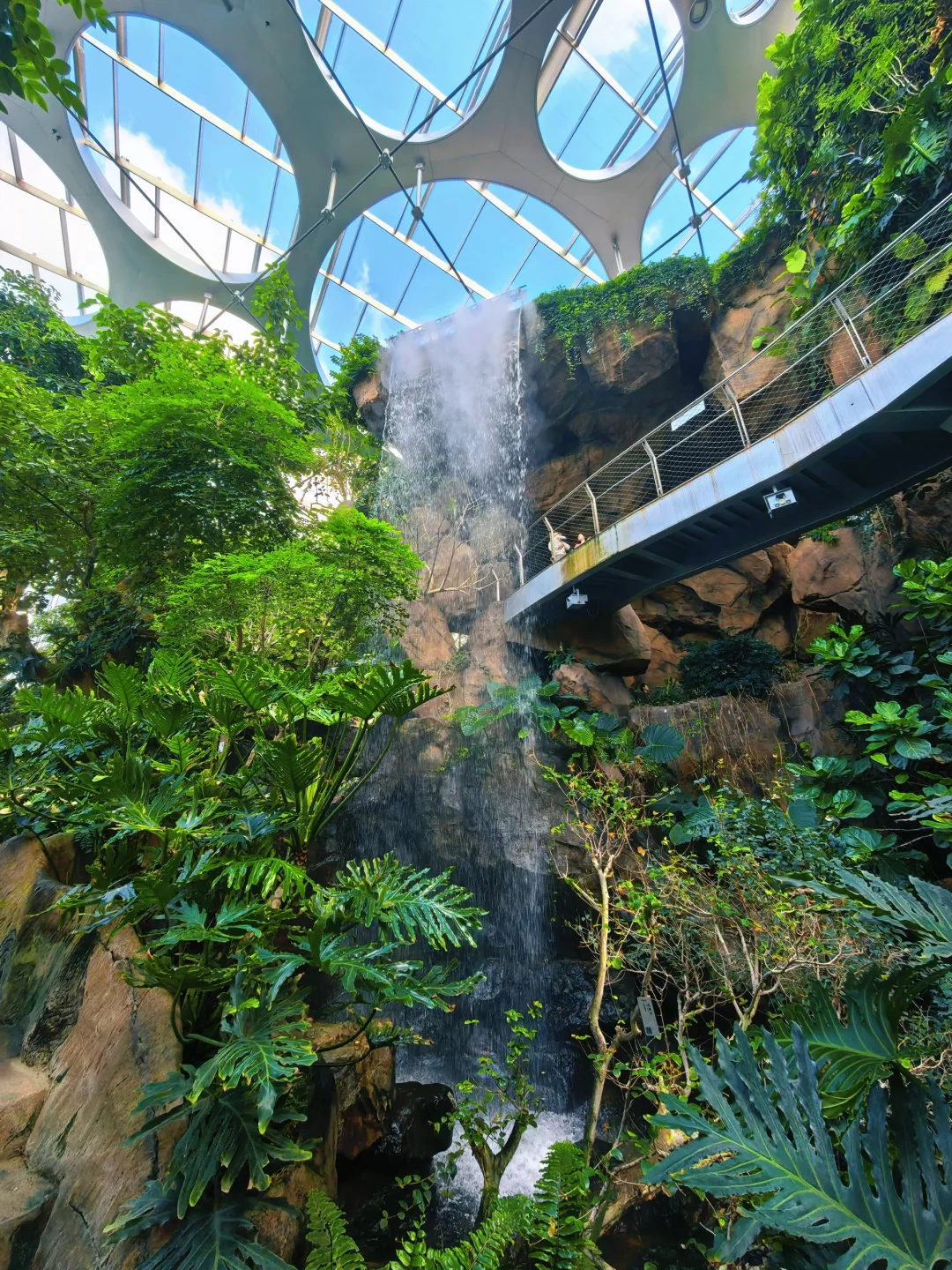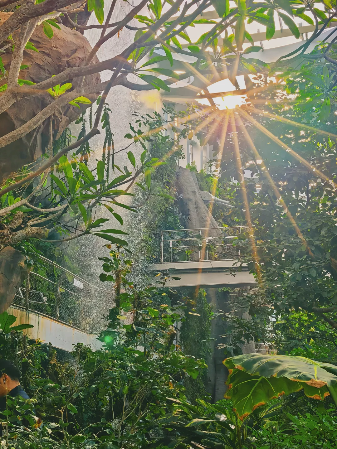 热带植物、瀑布、雾气、蜿蜒步道,像电影里的镜头。
