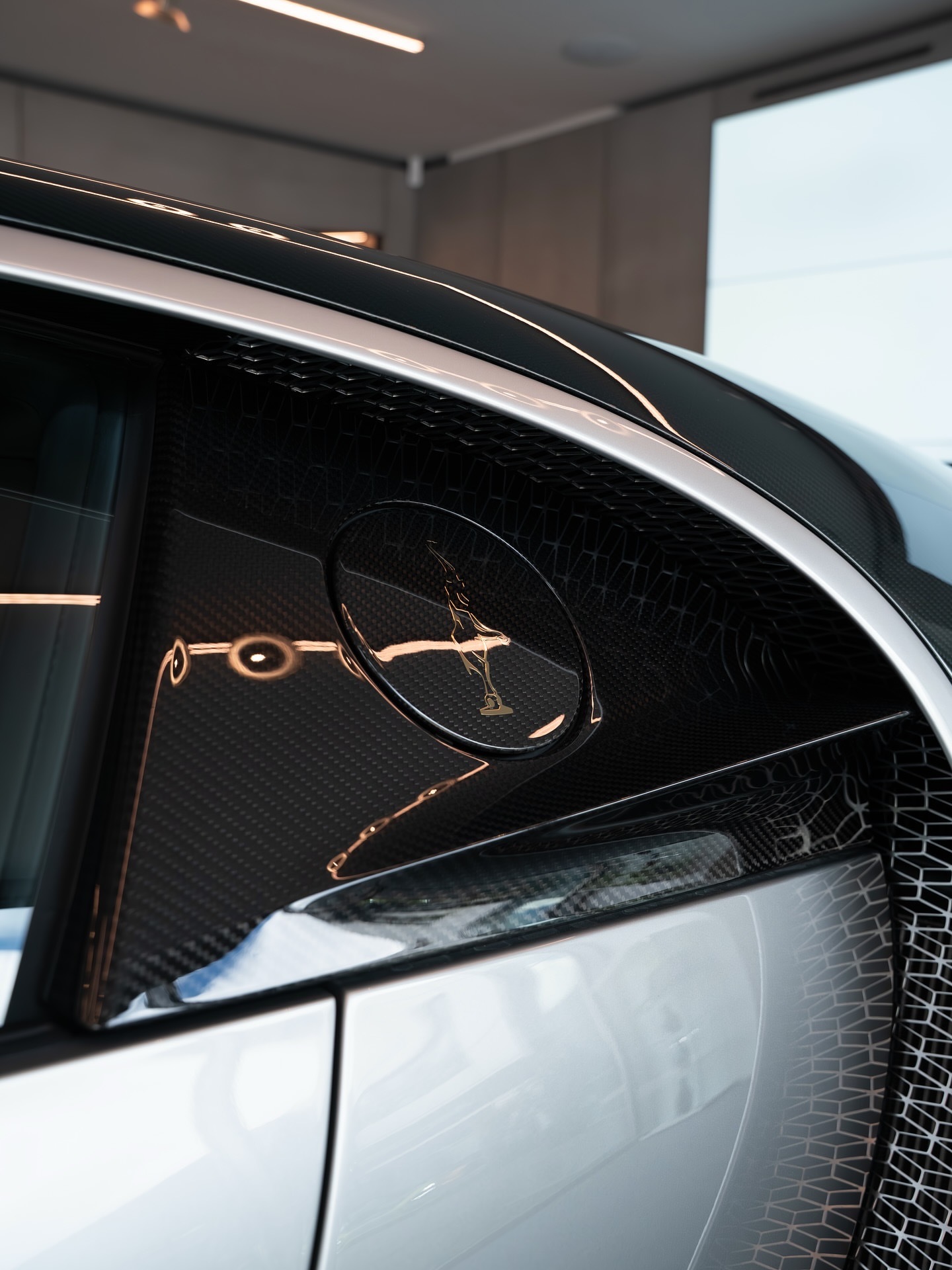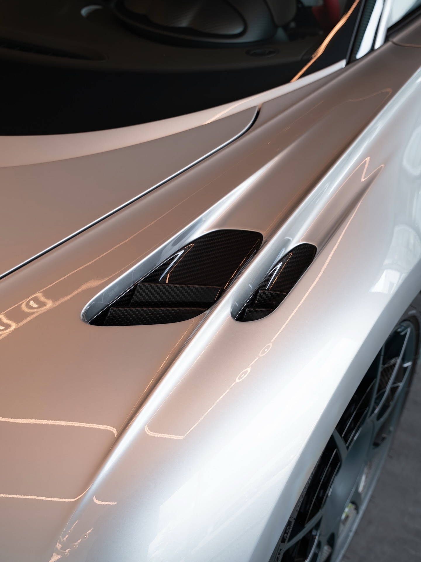 在这里,性能与艺术完美相遇。裸露的绿色碳纤维与银色漆面交相辉映,强烈地突出了空气动力学线条和汽车那无可置疑的存在感。