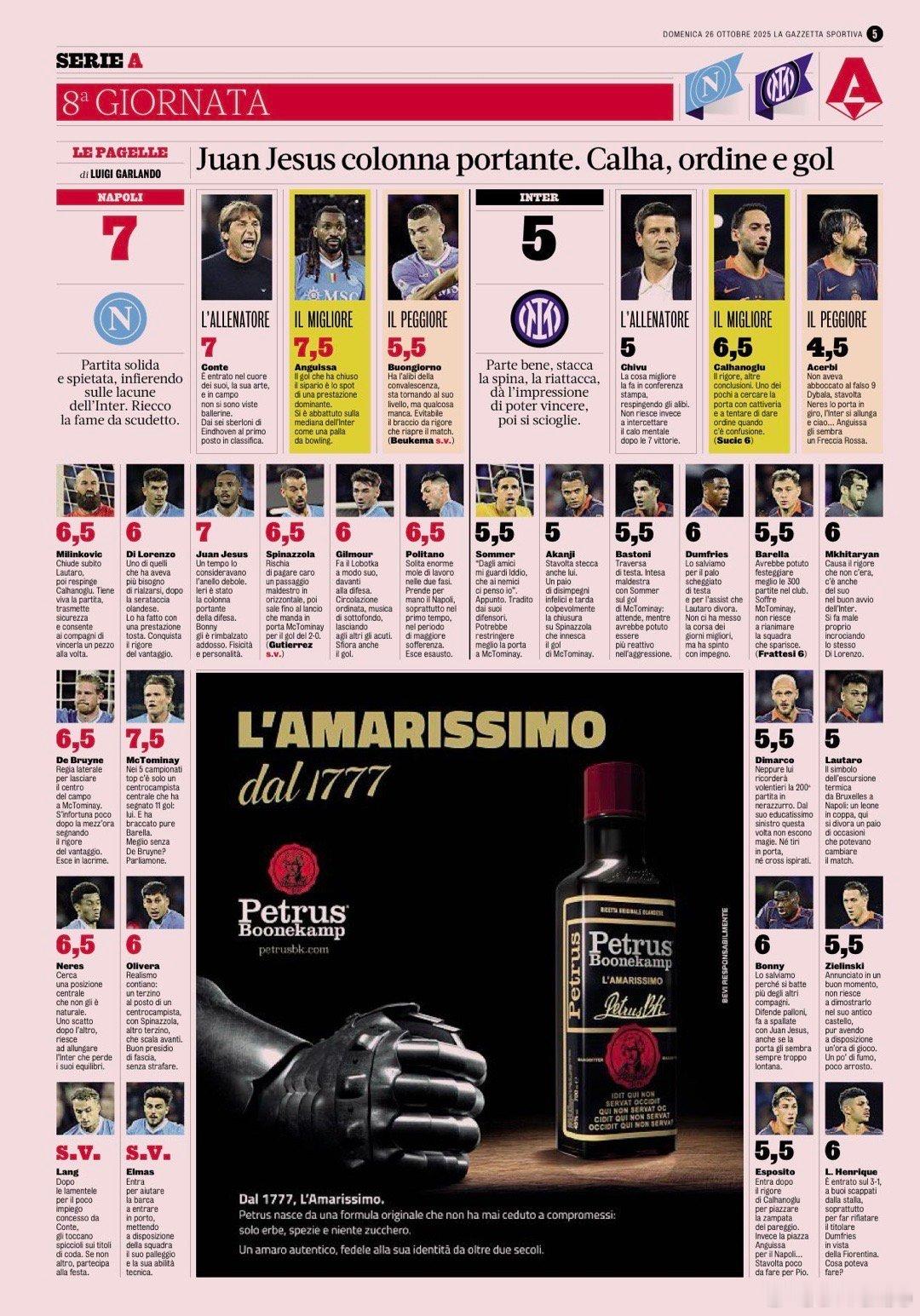 米兰体育报赛后评分如下那不勒斯3比1国米国际米兰热点解读