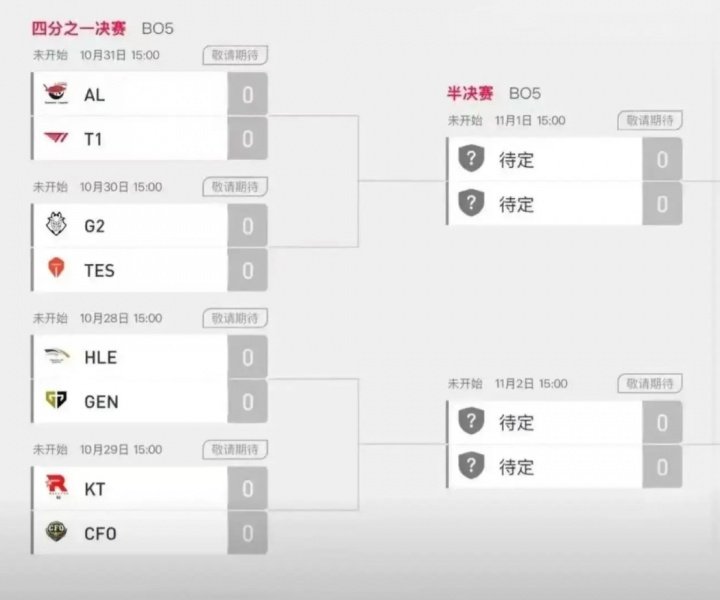 今日LPL官网再次更新赛程图:上半区(AL半区)半决赛改为11月2日,下半区(KT半区)半决赛改为11月1日。这样AL和T1的其中一支战队就避免了背靠背BO5。图1为旧赛程,图2为新赛程