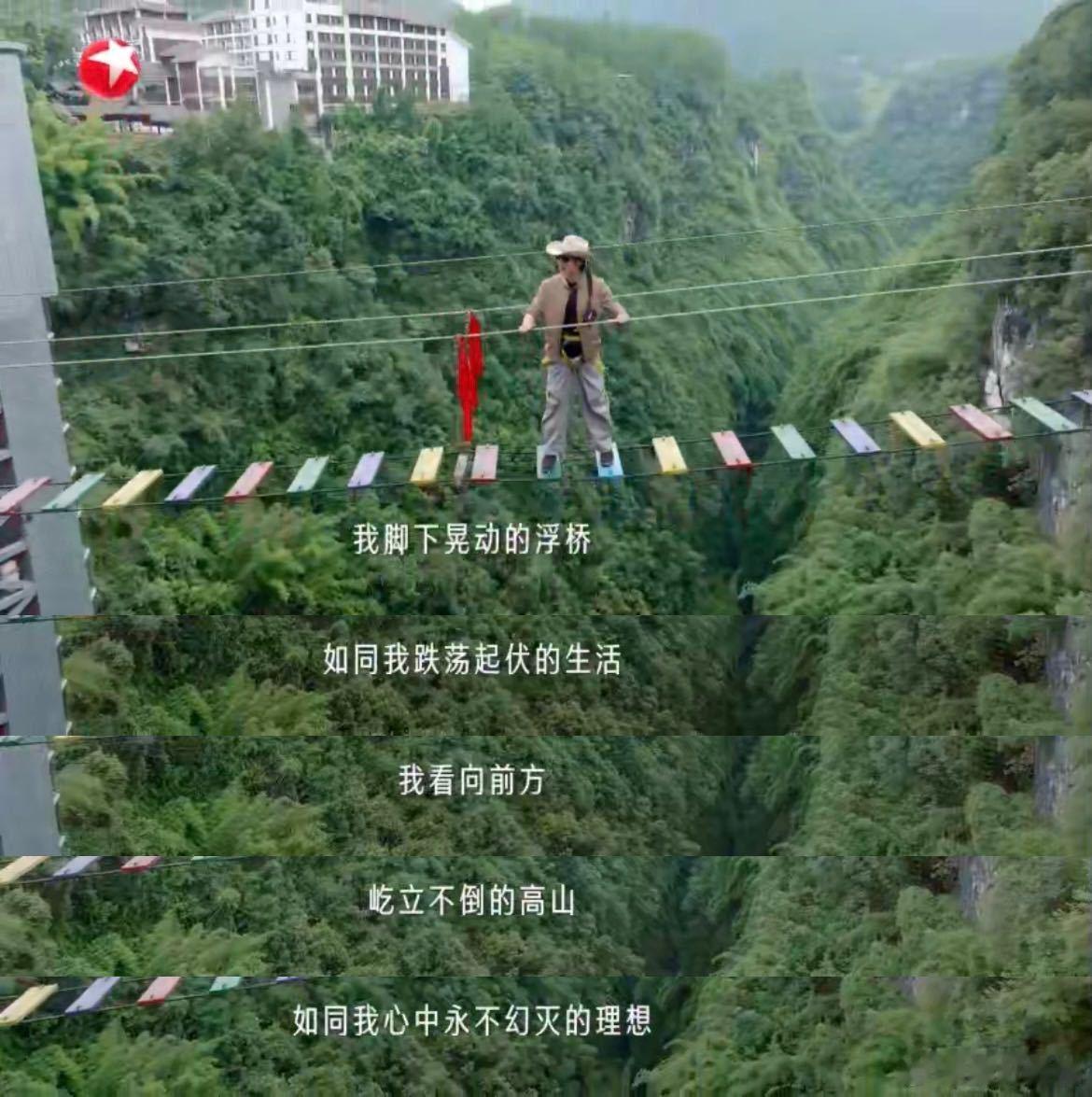 内娱最大胆的艺人出现了于适在高空吊桥上居然一只手都不扶!本来高空走吊桥就够难了