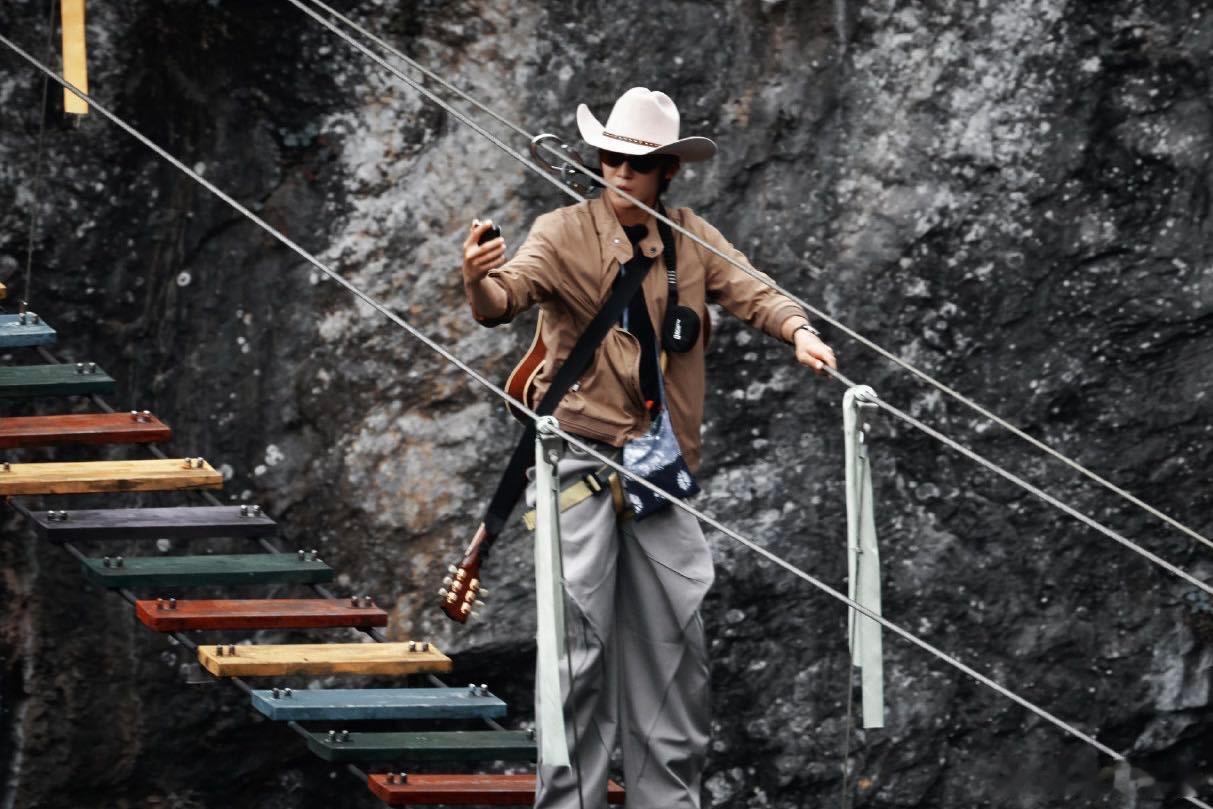 内娱最大胆的艺人出现了 于适在高空吊桥上居然一只手都不扶!本来高空走吊桥就够难了,他还能腾出双手准备弹唱,全程稳得不行 ​​​