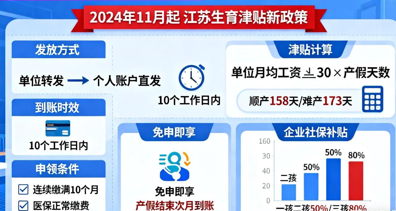 好消息! 江苏生育津贴发放方式大调整, 11月起钱直接打你卡上 2025年11月1日起,江苏省调整生育保险生育津贴发放方式,由原发放给用人单位改为医保经办机构一次性直接发放至女职工个人账户,旨在简化流程、提高效率,提升职工获得感。 政策明确,符合条件(用人单位连续缴满10个月生育保险费,含生育当月且医保正常缴费)的职工,在定点医疗机构完成生育医疗费用结算后,线上/线下提供银行卡号等信息,医保机构会在10个工作日内打款;若30个工作日内未提供信息,仍按原渠道发至用人单位,职工可通过“江苏医保云APP”等完善信息。 此外,江苏大部分地区已实现生育津贴“免申即享”,系统自动核信息无需额外材料,产假结束后通常次月到账;津贴按“用人单位上年度职工月平均工资÷30×产假天数”计算(顺产158天、难产173天等),同时企业在女职工产假期间的社保费用,生育一孩、二孩可获50%补贴,三孩80%补贴,2024年全省共发放生育津贴83亿元。