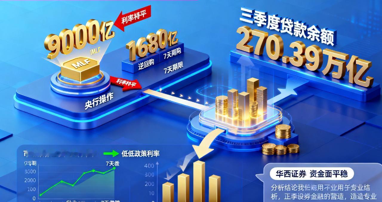 9000亿+1680亿! 央行双重操作维稳市场, 普通人该关注什么信号? 2025年10月24日央行发布公告,将于10月27日开展9000亿元1年期MLF操作(固定数量、利率招标、多重价位中标),同日还开展1680亿元7天逆回购操作(中标利率1.40%,与此前持平),核心目的是保持银行体系流动性充裕。 同期市场资金面表现平稳:上海银行间同业拆放利率(Shibor)隔夜持平、7天微降,DR007加权平均利率低于政策利率,上交所1天国债逆回购利率下降;华西证券分析认为,因税期未到、资金占用少,后续资金面有望持续平稳。 此外,央行此前发布的2025年三季度数据显示,截至三季度末金融机构人民币各项贷款余额270.39万亿元(同比增6.6%),前三季度人民币贷款增加14.75万亿元,反映出信贷对经济的支持力度。