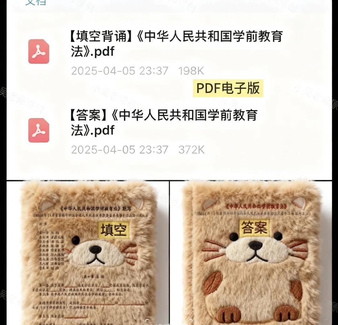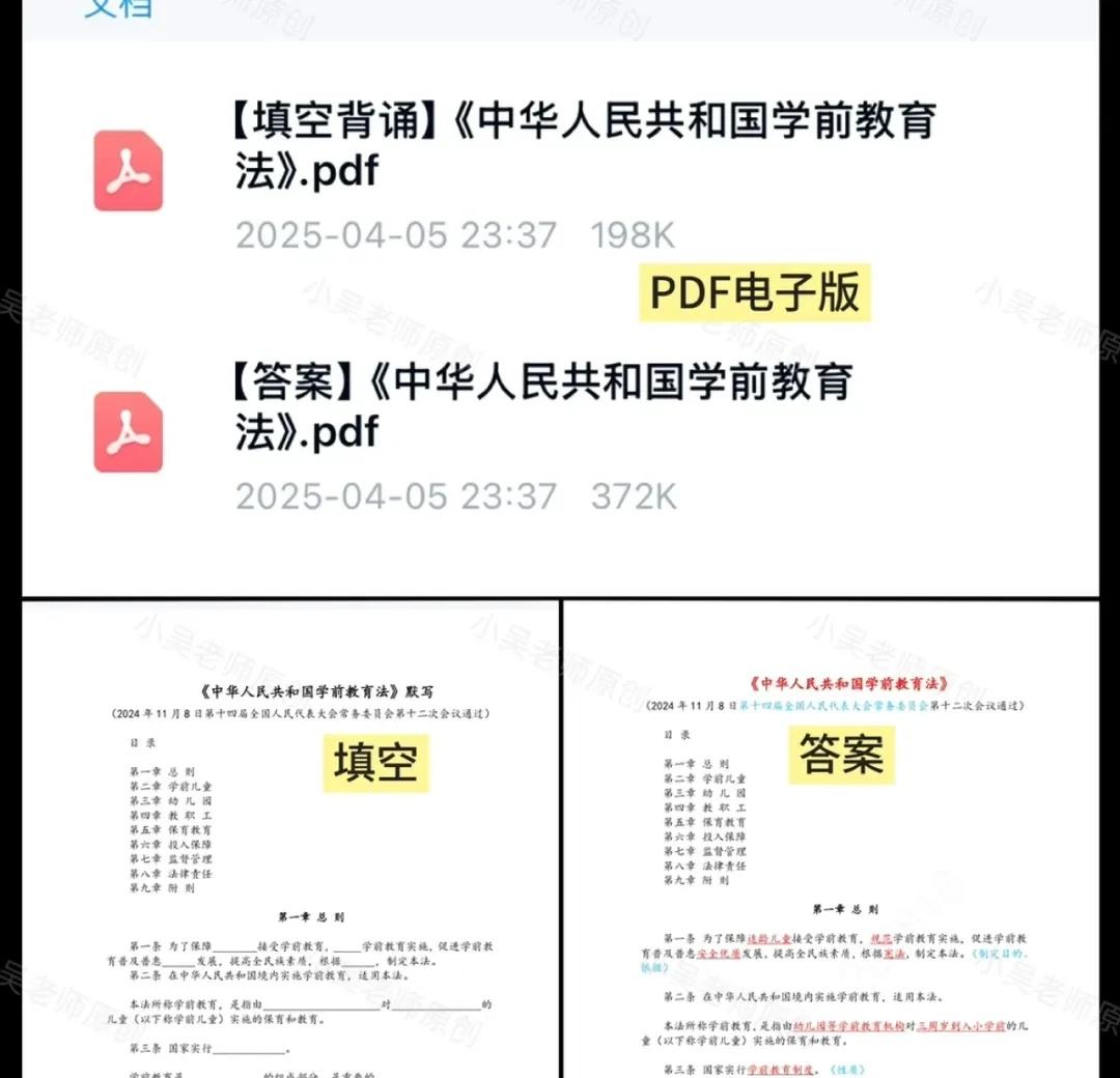 学前教育法|一起来看毛茸茸的书好吗? 直接打印|《学前教育法》背默·速记 【电子素材】直接打印【填空➕答案】 ⭐跟着上面的挖空法多读几遍 联系上下文去背诵记忆更容易记住~ ⭐频繁常考知识点要牢记。 用正确的方法,提高记忆能力。 【填空+答案】(答案部分已重点标记高频考点) 指南背诵技巧 儿童学习与发展指南 幼儿园教育指导纲要 幼儿园工作规程 学前教育法 幼师考编题库 幼儿园保育教育质量评估指南 幼儿园教师资格证笔试