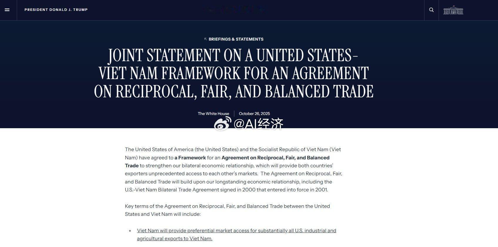 美国称与越南宣布达成互惠、公平、平衡贸易协议的框架。美国将维持对越南20%的关税,将确定产品及潜在关税调整方案,以使友好伙伴获得零关税的互惠待遇。将寻求在未来几周内达成协议。