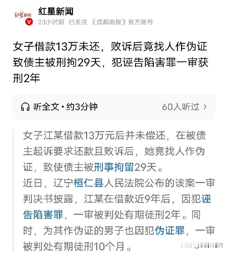 “欠钱的比大爷还嚣张!”辽宁本溪,女子借了13万一直不还,债主告上法院,女子不想还钱,又怕败诉,找人伪造3张收据,害的债主被刑事拘留29天,最终,女子把自己和帮手都悲剧了! 都说欠债还钱天经地义,可是,60岁的江某,借了13万后赖着不还,还干出一系列让人气愤的事。 2016年6月3日,江某和丈夫董某找徐某借钱,那时为了借到钱,好听的话说的那叫一个真诚,没想到,钱借到手后就耍起无赖了。 当天,江某从徐某那里借了13万块钱,说到时候一定还,还郑重其事的写了一份借据。 然而,到了还钱日期,江某突然变了卦,她不想还这笔钱。 徐某实在要不回这笔钱,便在2018年4月17号,把江某告上法院,要求她偿还这13万元。 江某不想还钱,但又怕败诉,就想了一个坏主意。 她联系了男子李某,让他帮一个忙,没想到,李某还真就同意了,帮她伪造了3张收据,收据上写着:这13万本金已经偿还了。 江某就把这3张假收据交给了法院。 原来,江某也干过类似的事,她曾是某单位职工,在2004年就因为犯了伪造单位印章罪,被法院判处拘役6个月,缓刑1年。 因为她自己有过类似经历,所以,这次江某才能想出这么一个缺德又坑人的办法。 同年9月17日,法院作出判决,要求江某、董某偿还徐某13万元借款。 判决一下来,江某心里不服,提出上诉。 2019年1月21日,二审法院判决,驳回江某上诉,维持原判。 按说这时候江某应该老老实实把钱还给徐某了吧,可她偏不。 2019年10月21日,江某居然跑到某某县公安局报案,说徐某虚假诉讼,并把李某伪造的3张收据交给警方,更可气的是她还让李某作伪证,证明这13万元已经还给了徐某,有收据为证。 李某对江某还真是死心塌地,真在在公安机关说了假话,出具了虚假证言。 某某县公安局当天就立案调查了,次日,也就是2019年10月22日,徐某就被采取了刑事拘留强制措施,他在里面待了整整29天,一直到同年11月19号才被取保候审。 直到2023年2月15号,某某县公安局才撤销了这个案件,徐某这才洗清了冤屈。 徐某怎么也没想到,借钱还借出仇来了,这真是欠钱的比大爷还嚣张,他所遭受的这一切的始作俑者就是江某。 其实,李某也不是什么好人,59岁的他曾因犯盗窃罪、抢劫罪、故意伤害罪、妨碍公务罪,多次被判有期徒刑,可以说是老油条了。 2023年12月27号,徐某报案,某某县公安局立案调查,次日,也就是12月28号晚上江某、李某被抓获归案。 法院对此会怎么认定呢? 1、法院认定:江某的行为构成诬告陷害罪。 《刑法》第243条规定:捏造事实诬告陷害他人,意图使他人受刑事追究,情节严重的,处三年以下有期徒刑、拘役或者管制;造成严重后果的,处三年以上十年以下有期徒刑。 江某明知13万元借款未偿还徐某,仍伪造还款证据并报案,意图使徐某被刑事追责。 江某向公安机关提供虚假收据,指使李某作伪证,导致无辜的徐某被刑拘29天, 徐某因江某诬告,被错误限制人身自由,对其身心造成了一定的伤害,名声也受了影响。 江某因欠债败诉后,应该及时将13万还给徐某,可她赖账不还,反而通过伪造证据“反咬一口”,将民事债务纠纷升级为刑事案件。 江某的行为直接导致债主徐某无辜入狱29天,严重干扰法律公正。 法院认定江某构成诬告陷害罪。 2、法院认定:李某的行为构成伪证罪。 《刑法》第305条规定:在刑事诉讼中,证人、鉴定人、记录人、翻译人对与案件有重要关系的情节,故意作虚假证明、鉴定、记录、翻译,意图陷害他人或者隐匿罪证的,处三年以下有期徒刑或者拘役。 李某在江某诬告陷害徐某的刑事诉讼过程中,故意出具虚假证言,证明13万元已经偿还并由其出具收据,意图陷害徐某,符合伪证罪的构成要件,所以构成伪证罪。 虽然李某没有自动投案等自首情节,但他在庭审后能如实供述自己的罪行,自愿认罪,根据上述法条中“如实供述自己罪行的,可以从轻处罚”的规定,法院考虑从轻处罚。 最终,法院作出一审判决:江某犯诬告陷害罪,判处有期徒刑2年。 李某犯伪证罪,判处有期徒刑10个月。 江某这事做的太不地道,明显是恩将仇报,本来借了徐某13万元,解决了自己的燃眉之急,到了还款日期就该还钱,可她倒好赖账不还不说,还找人作伪证,害的债主被关29天。 最终,江某也付出了代价,把自己和帮手送进去了。 要不说,做人得讲诚信,好借好还再借不难,可别学江某和李某,不然最后吃亏的还是自己。 关注@福康说法