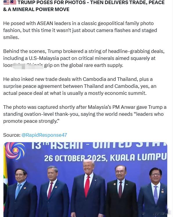 特朗普总统与东盟岭导人的合影,同时推进贸易、和平与矿产战略。