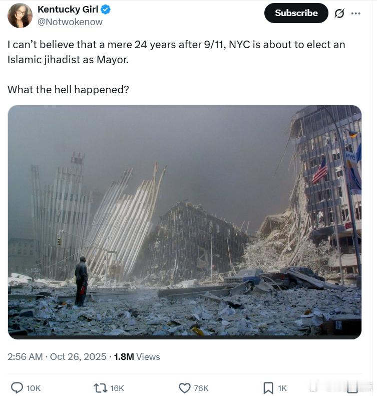 “真不敢相信,距离“9·11”才短短24年,纽约市竟然快要选出一位伊斯兰圣战分子当市长。”