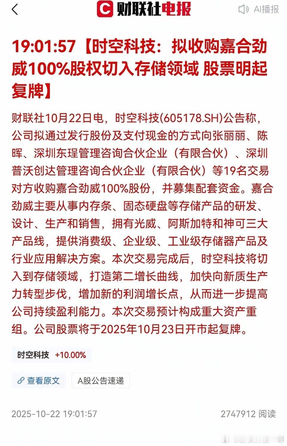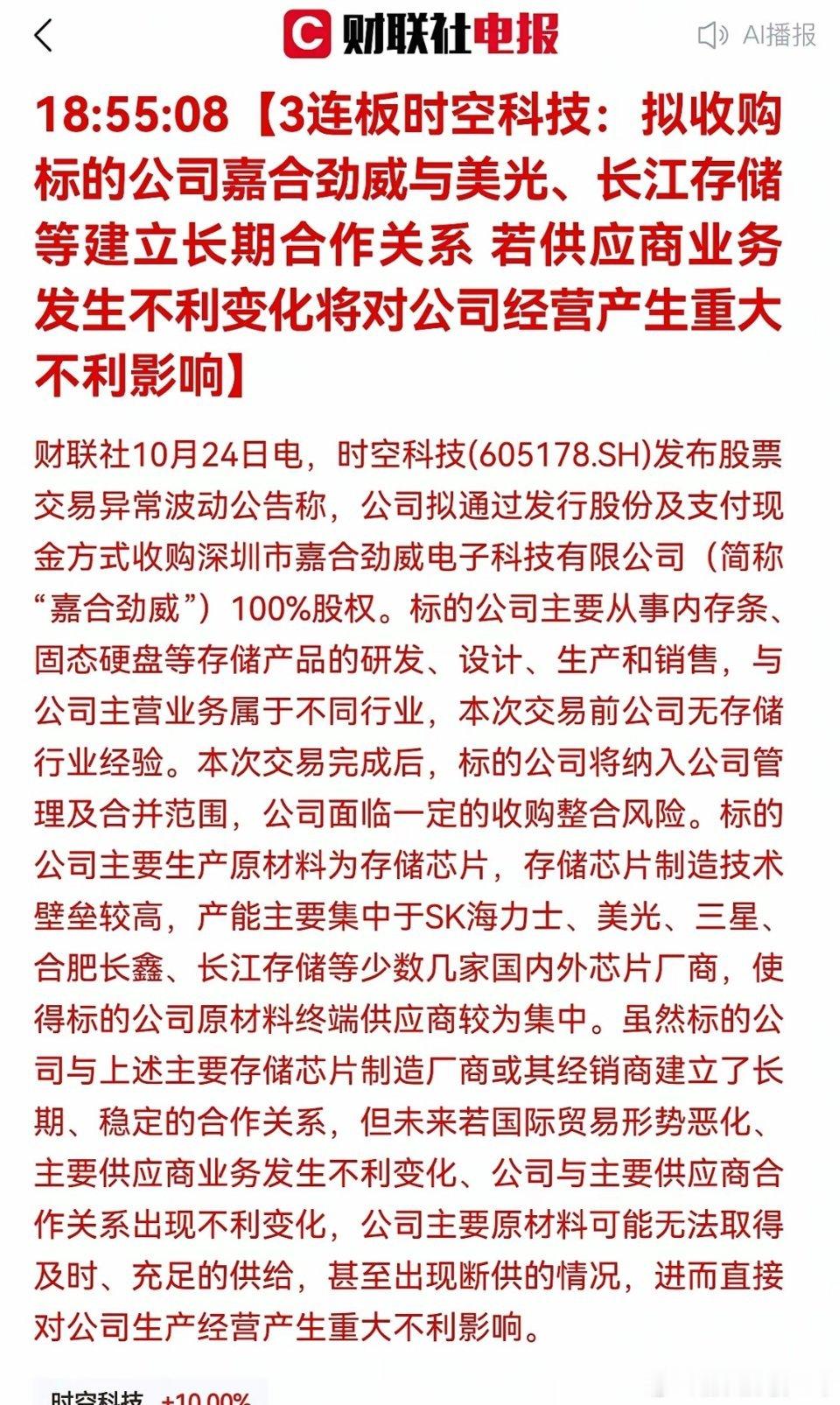 时空科技于22日晚间发布公告,拟收购嘉禾劲威100%的股权,进入存储领域。随之公司股价连续2天一字涨停,加之信息发布当天,已实现三连板了。