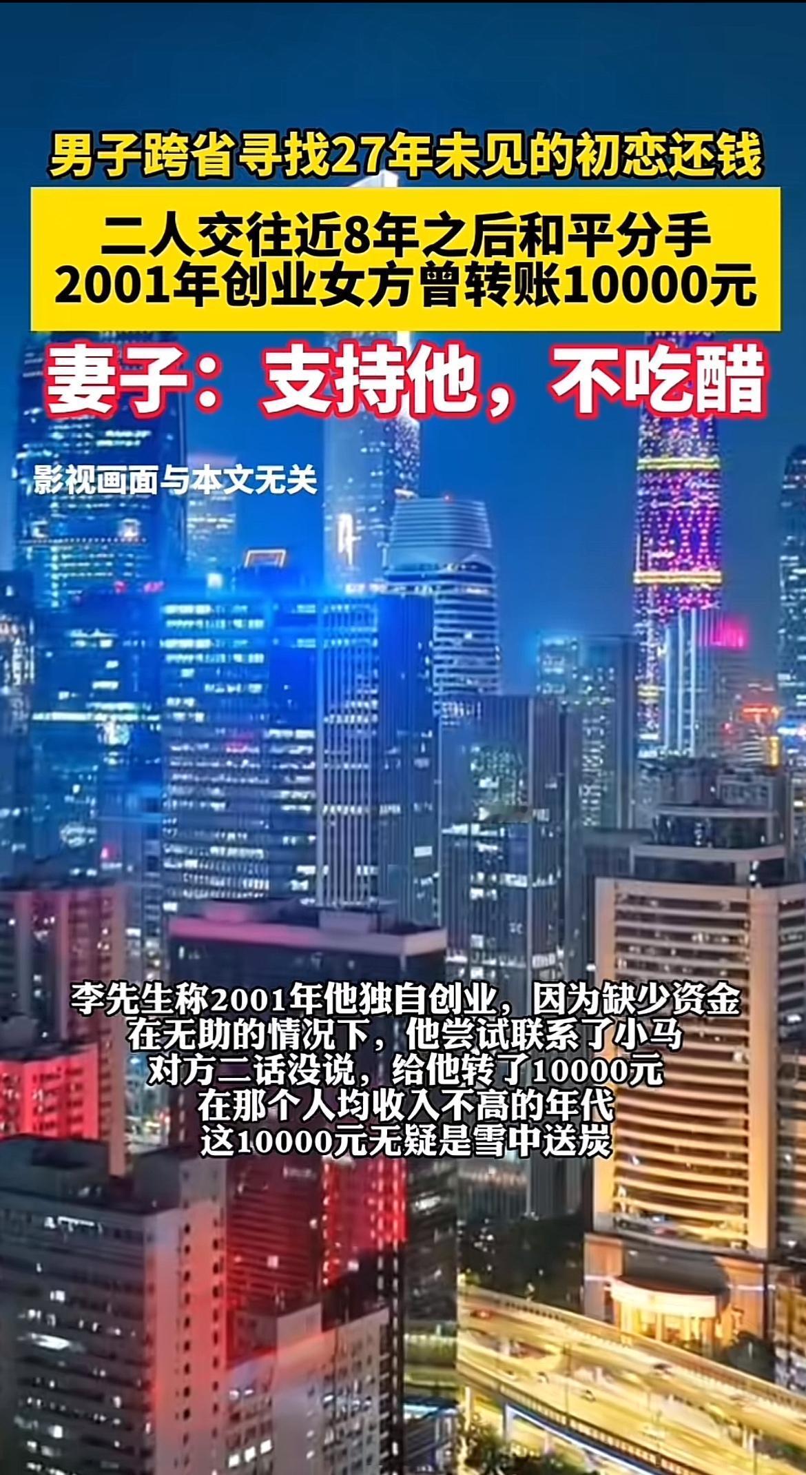 最近,安徽淮北的李先生干了件让人点赞的事。他跨省跑到河南,想找到27年前的初恋还钱。1991年,他和初恋小马相恋近8年,后因家庭因素分手。2001年他创业缺钱,小马二话没说转了10000元,在当时这可是雪中送炭。两年后李先生生意有起色,却因丢手机和小马断了联系。这么多年,还钱成了他的心结。 李先生的妻子超赞,支持他还钱,还不吃醋。可惜这次通过社区走访没找到人。但这事儿太暖了,李先生坚守诚信,妻子理解信任,他们用行动告诉我们,诚信和信任在生活里多重要。